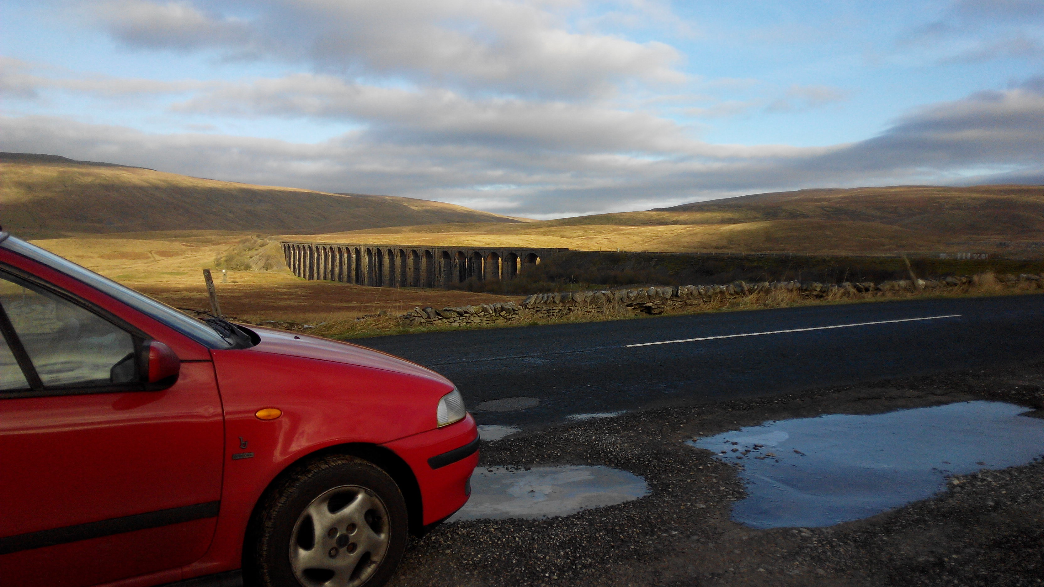 Well, there we were on the beautiful Ingleton-Hawes road yesterday, in deepest North Yorkshire, and suddenly out of the bleakness of the moorland rose this magnificent viaduct, Ribblehead Viaduct. Totally unexpected. Hadn’t checked anything much about the road beforehand, and well, there it was. FAMOUS and we didn’t even know it was there until we happened upon it. It was built in the 1870’s as part of the Settle-Carlisle Railway, but over 100 of the workmen, their wives and children lost their lives through accident or disease and are buried in Chapel-le-Dale Church. The history is well worth checking out, tragic – but that viaduct is amazing!