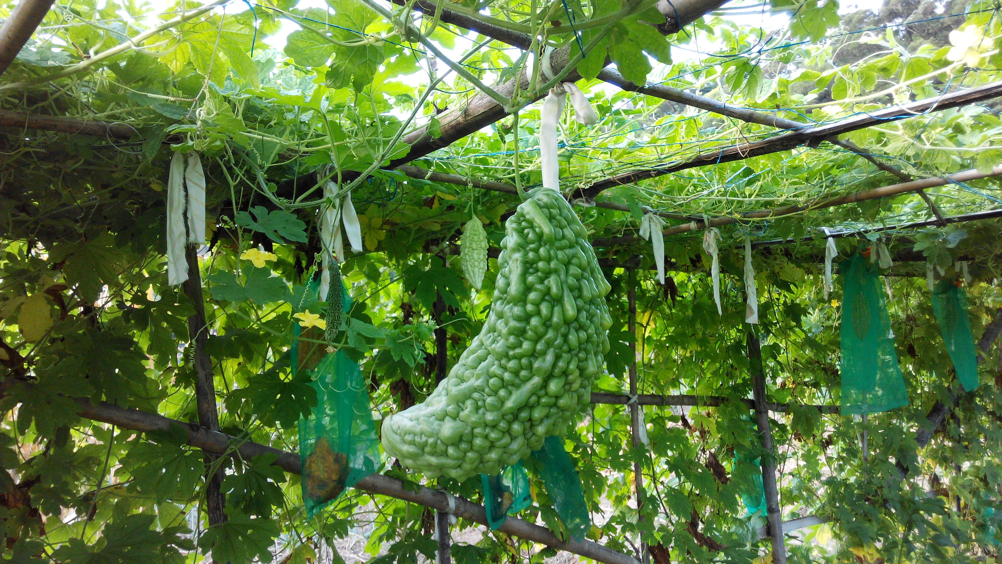 Bitter melon or bitter gourd is very popular here in Taiwan, and yesterday I found some growing just up the road. So here it is – mostly covered in bags to stop the birds and squirrels from eating it. Do they really like it, I ask myself?