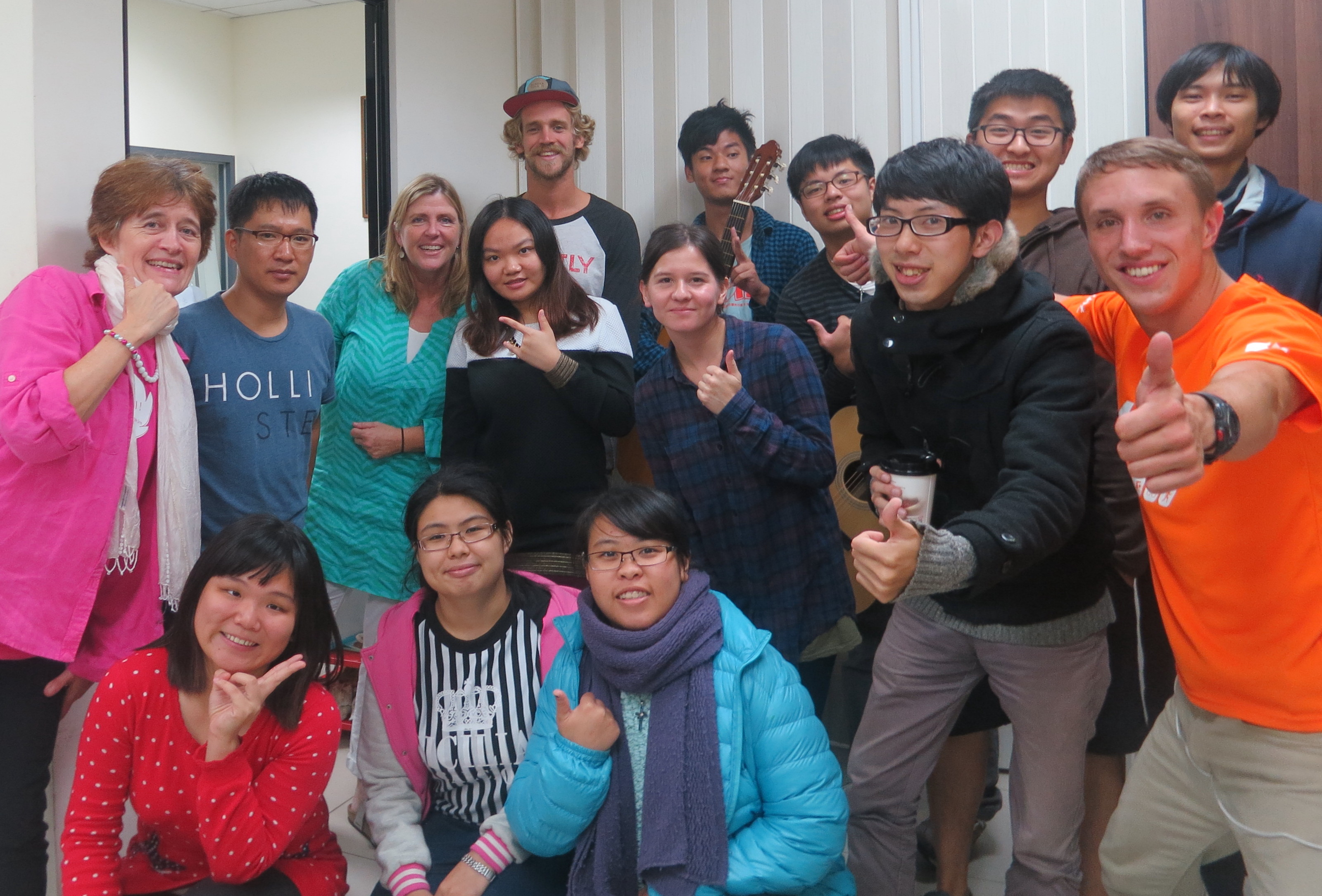An surprise visit yesterday from a team of 5 from Global Teams International ~ YES! Well, it was certainly a surprise for most of our students, and although I knew that 2 people were coming to visit, when 5 turned up – that was the nice surprise! The 2 leaders, Sheryl and Michael had been to a Global Teams Conference in S. E. Asia, and had now come on their first ever visit to Taiwan. So here they were ~ from USA, Korea and Costa Rica ~ and they were well-entertained by our students, who sang, talked, shared and posed for photos ~ then a visit to Advent Church, dumplings for dinner in Tamsui, and a visit to The Rock Coffee Shop, also in Tamsui….