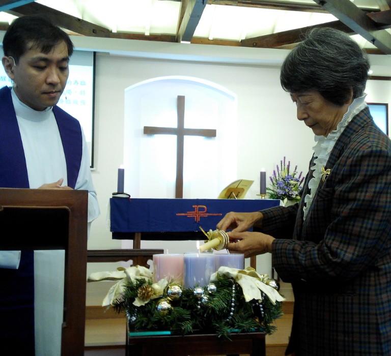 Mrs. Grace Chien 簡師母 lights the first Advent Candle at St.Peter’s Church, Chiayi on Advent Sunday 2015. She and Bishop John C.T. Chien 簡啟聰主教 [1940-2013] have given their whole lives in faithful Christian service. An amazing witness! Thanks be to God!