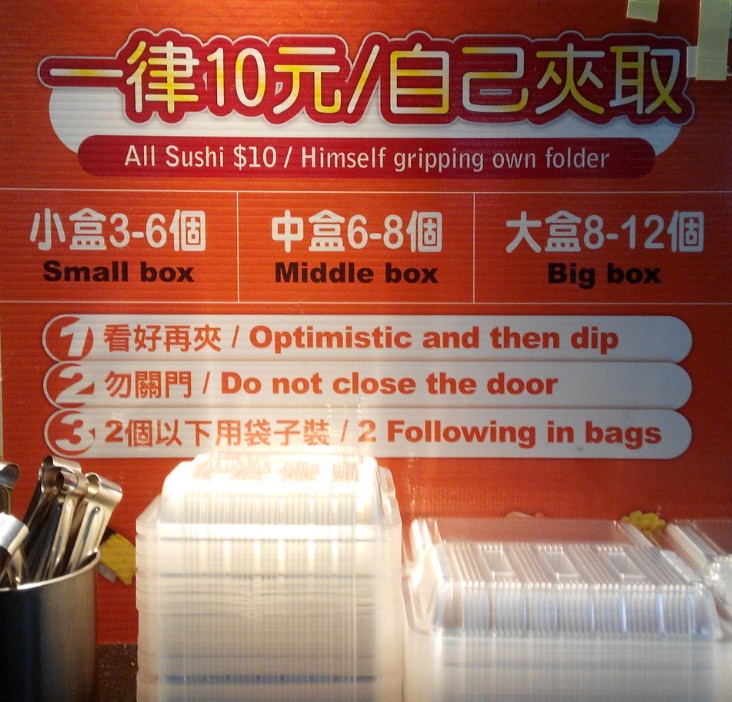 Taiwan Lost in Translation @ Taipei Bus Station! And the highlight of waiting for a bus there is the creative use of English at the sushi bar…. It certainly always helps to be ‘optimistic and then dip’ in whatever situation, whether choosing sushi – or waiting for a bus! Share this:Share Click to email a link to a friend (Opens in new window) Email Click to share on Facebook (Opens in new window) Facebook Click to share on X (Opens in new window) X Click to print (Opens in new window) Print Click to share on LinkedIn (Opens in new window) LinkedIn Click to share on Reddit (Opens in new window) Reddit Click to share on Tumblr (Opens in new window) Tumblr Click to share on Pinterest (Opens in new window) Pinterest Like Loading...