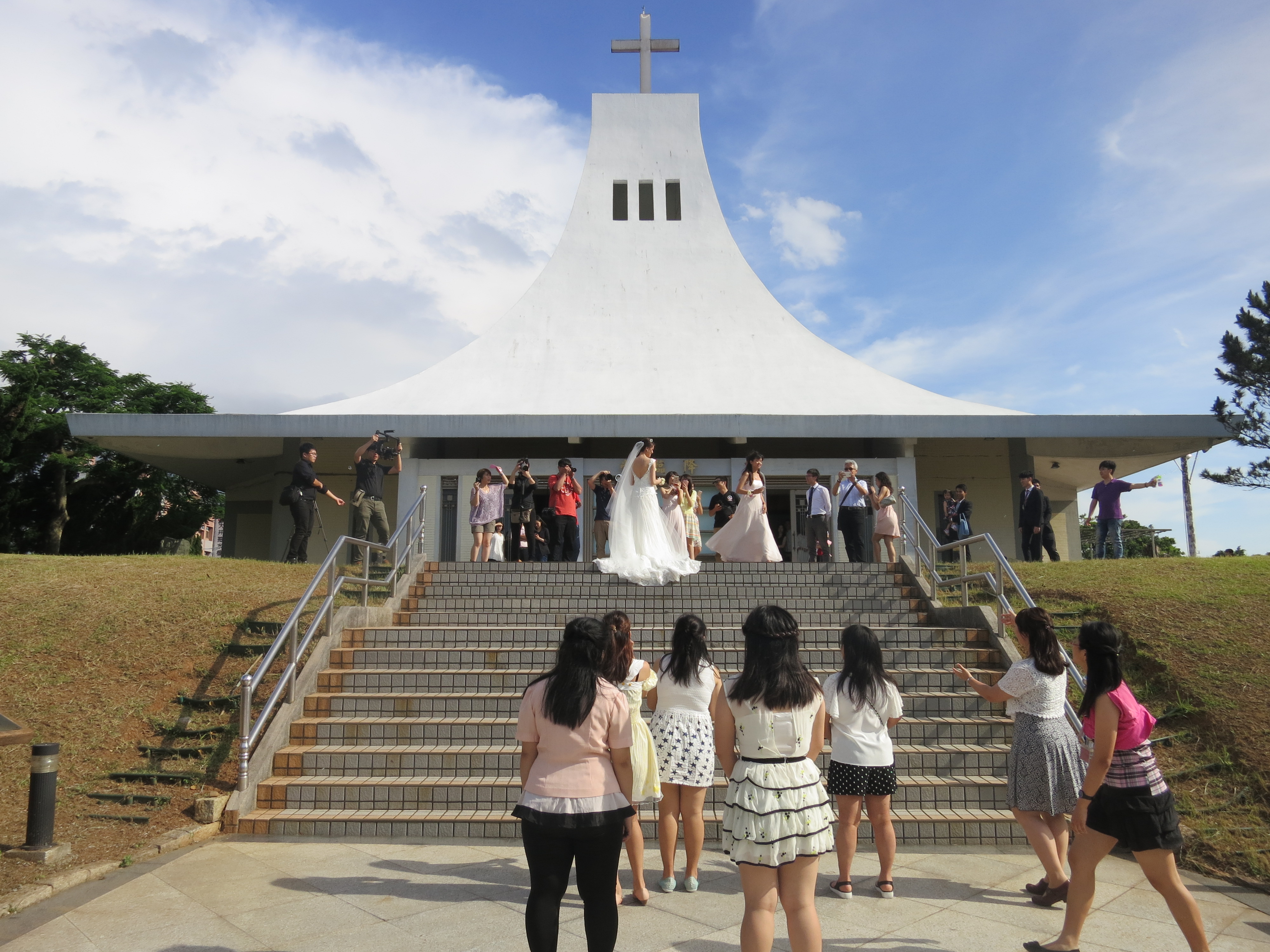 The wedding service was at 2:30 pm yesterday in Advent Church. It was led by Rev, Lennon Chang, chaplain and rector, and assisted by Rev. Wu Shing-Shiang. Our church choir sang a really lovely anthem. St. John’s University President Chen Jean-Lien gave a short address, and there were many faculty, staff, students and church members as well as friends and family in the congregation. The church was full! A beautiful and very relaxed service.