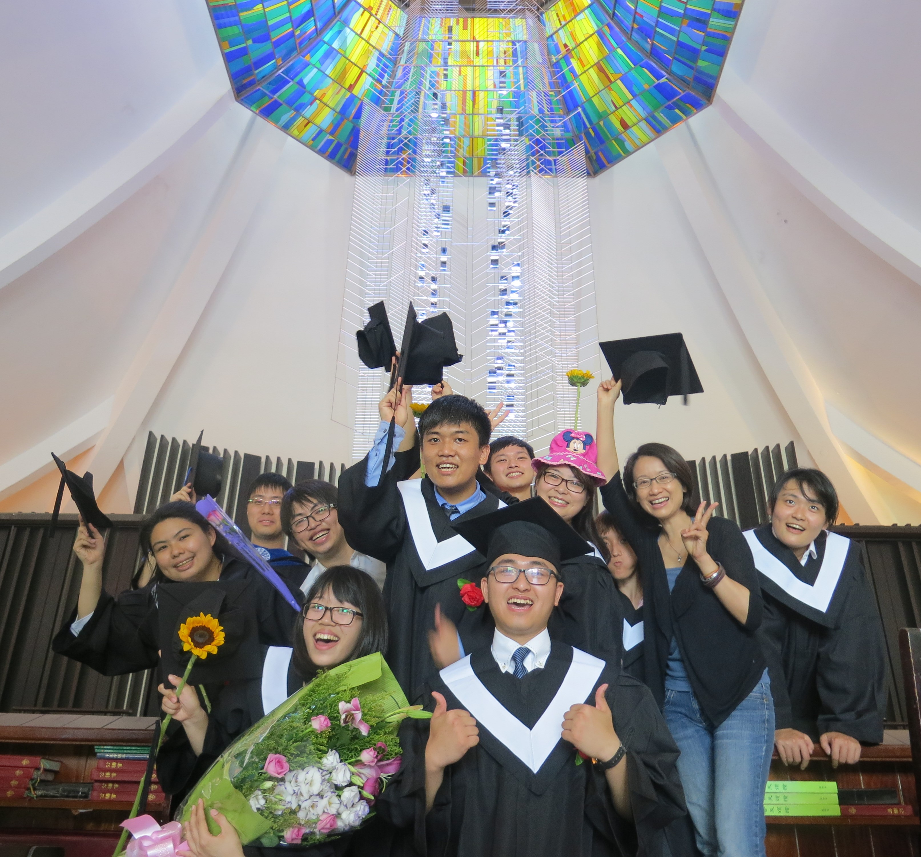 Today’s graduation was spectacular, as always – faculty and students gathered in gowns and mortar boards, parents and friends gathered with bunches of flowers and balloons, and the procession into the hall was led by 3 of our student fellowship students carrying the cross and 2 candles, and followed at the very end by chaplain Rev. Lennon Chang and Bishop Lai.