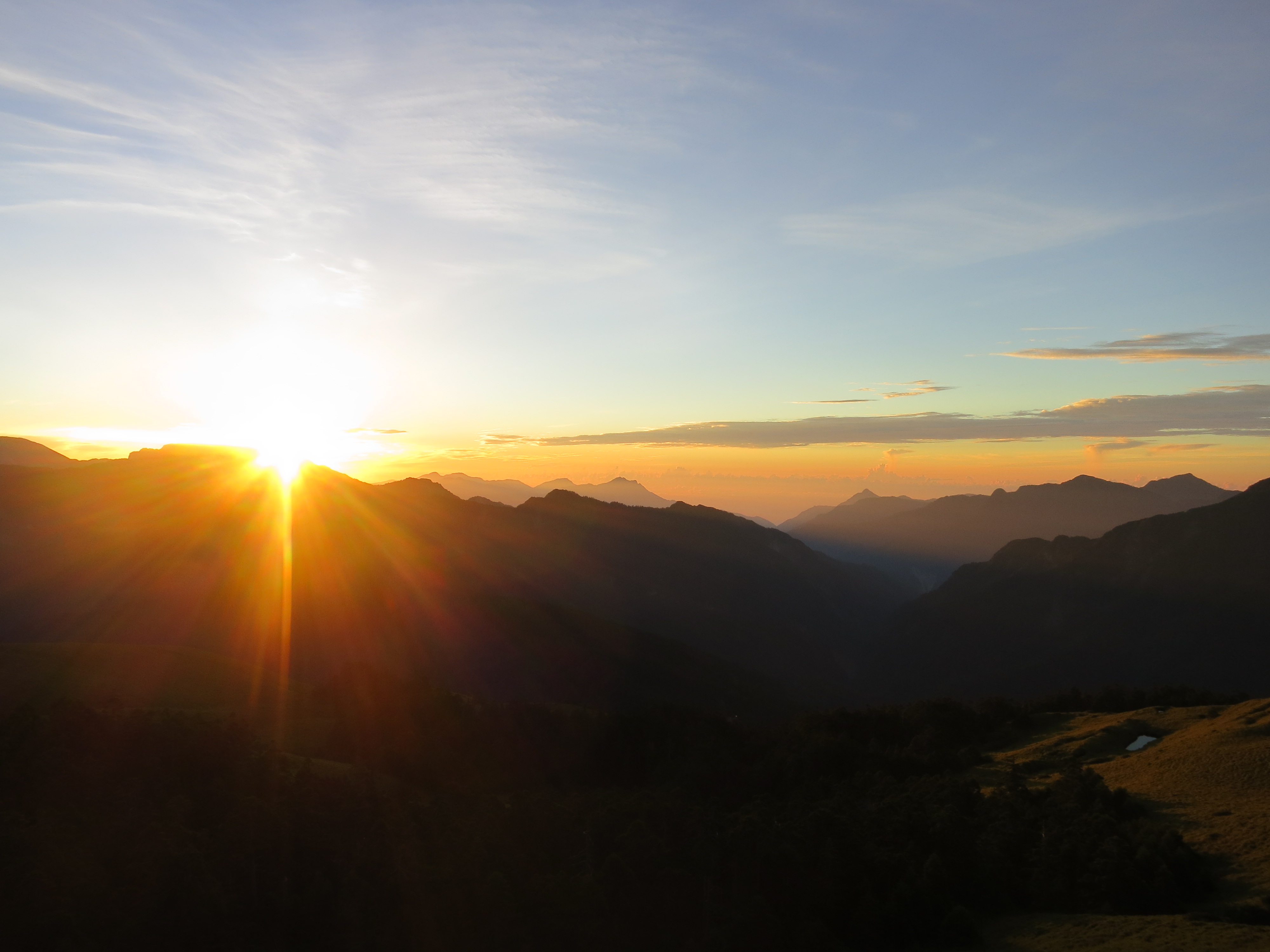 And so to bed. But be warned, staying in a campsite of over 30 small tents, dozens of people and at over 3,000m high is not luxury. I took photos of the 2 toilets to show you the luxuries available ha ha! The main luxury is water, down a steep slope at the stream. Other campers in other places in Hehuanshan have to bring all their water with them, which would be a nightmare. Camping with so many people is also not conducive to any kind of sleep. Unless you are naturally a heavy sleeper who can sleep through small children crying in the next tent, students chatting until midnight round their fire, and even an accompanying dog barking, forget sleep. By 3:00am our alarms were going off, and we were the first group up. Bleary-eyed and wondering what had hit us, by 4:30am we were headlighted and rucksacked up and in our warmest clothes, ready for the off. Off to see the sunrise which was starting just as we were departing the camp…