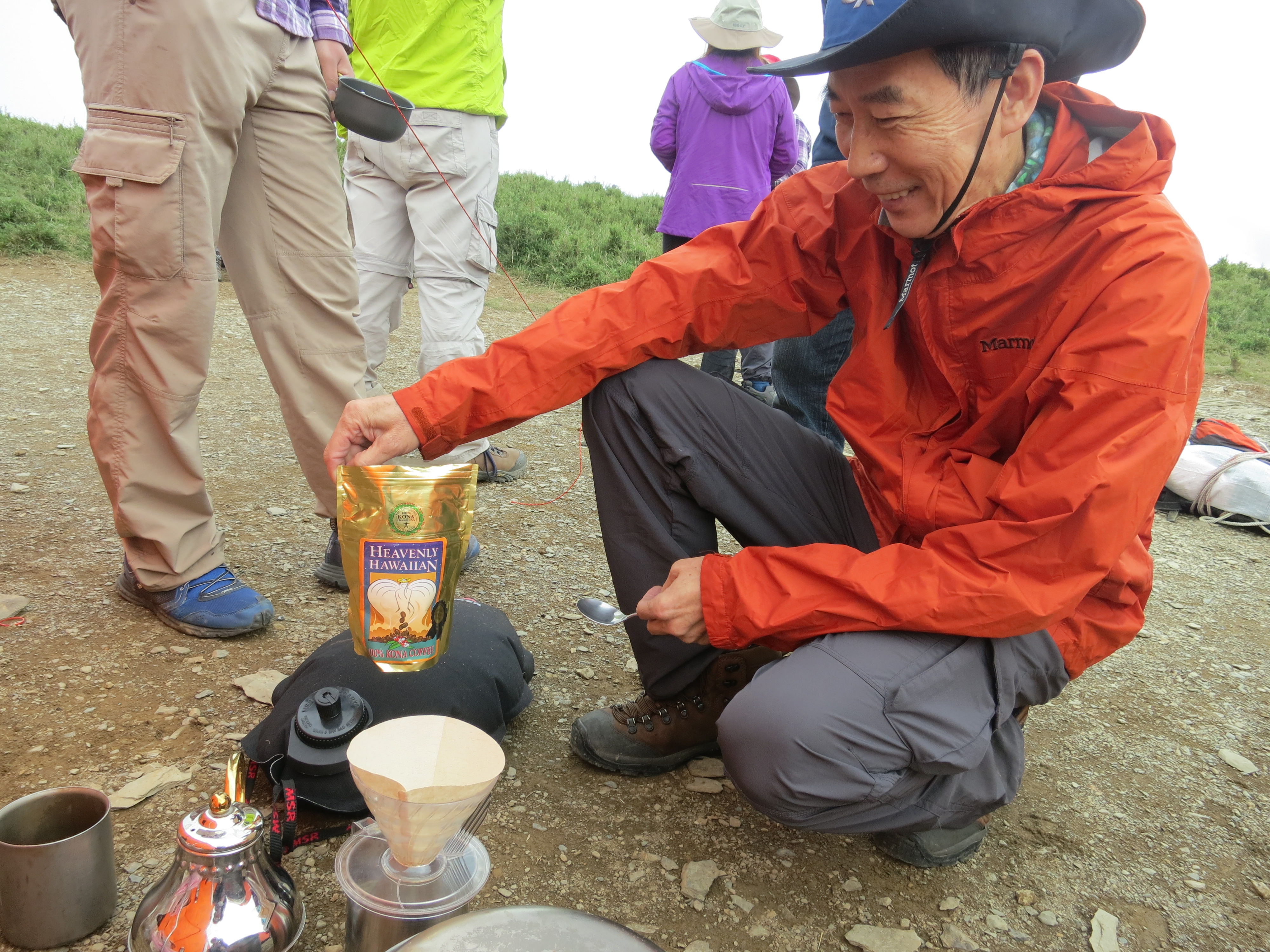 We arrived at the campsite by lunchtime, set up the tents, had instant noodles for lunch, followed soon after by afternoon tea, well, actually coffee. The most helpful, gracious and kindest A-Kuei had brought along Hawaiian Coffee, specially ground the night before, plus a very elegant long-spouted teapot to pour the water, which really upgraded the tone of the coffee ceremony!