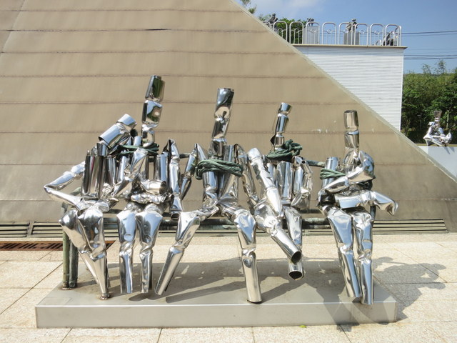There’s a free shuttle bus from Jinshan Town to the museum, and the shuttle buses are timed so you can get a good 2½ hours at the museum, and then go back. It takes that long to walk all around. There are plenty of other art exhibitions inside the museum, and lots of educational activities going on, but the important things that I wanted to see are the sculptures outside. And there are many. Very many. And many are huge. They’re made of all sorts of stuff, and they’re arranged in different groups. There’s a whole section of military people sculptures, some hanging by parachutes, some on a huge metal scaffolding kind of ship, another series of Taichi sculptures, and Ju Ming’s famous Living World series, including all sorts of quirky characters – a group of scientists (spot Einstein, Marie Curie, Michael Faraday, plus the Chinese inventors of paper and gunpowder), families, commuters, and Tin Men characters sitting on nearly every bench. Impossible to be bored, there’s so much to see!