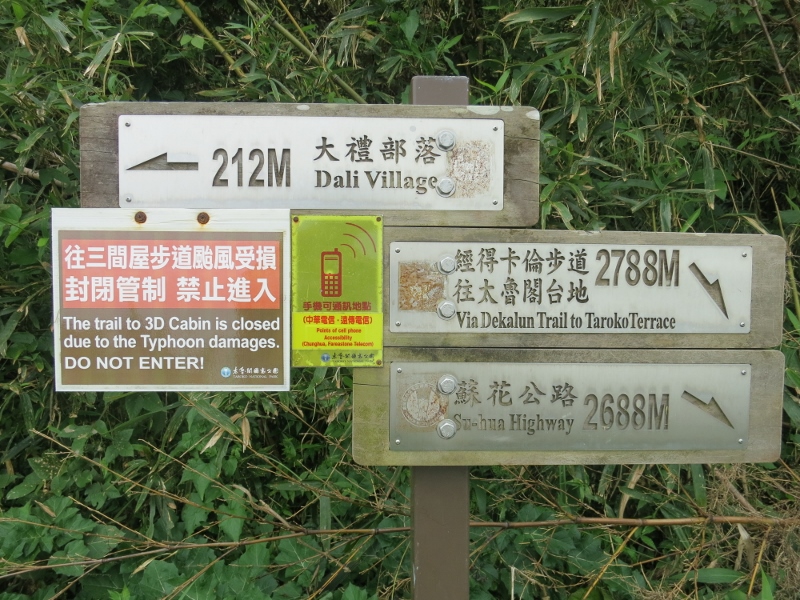 The mountains of the east coast go straight down to the sea with spectacular views over the Pacific Ocean. Liwu Mountain 立霧山 (1,274 m) is the first of the range, and has the same name as the River Liwu that runs through the gorge. The mountains also provide some protection from the fierce Pacific weather, allowing flowers, fruit trees and vegetables to flourish in the Truku (Taroko) villages of Dali and Datong 大禮大同部落 up on the plateau just behind and below the Liwu Ridge. It’s a real oasis! This photo shows Liwu Mountain and the mountains along the east coast as seen on Saturday early morning from where we were staying in Xincheng Town on Friday night. It’s these mountains that were our destination!