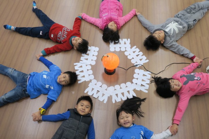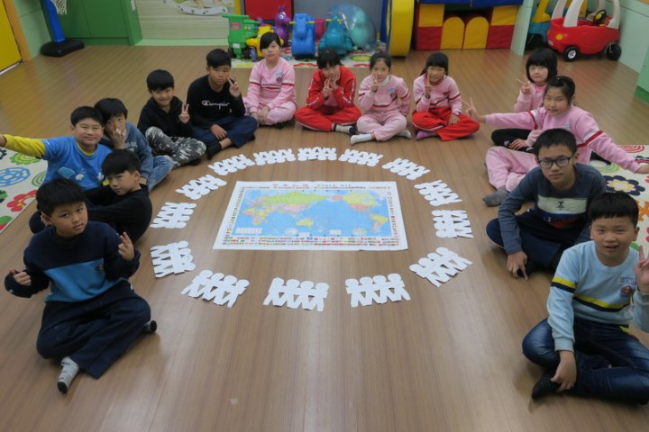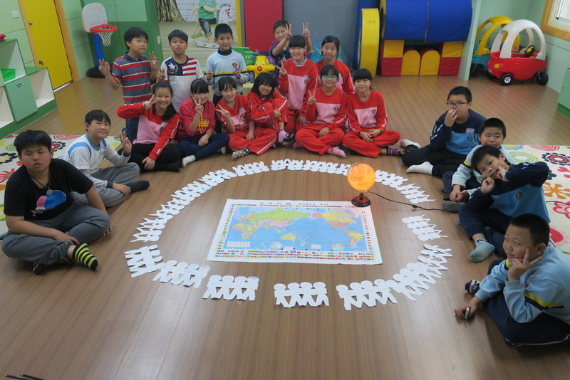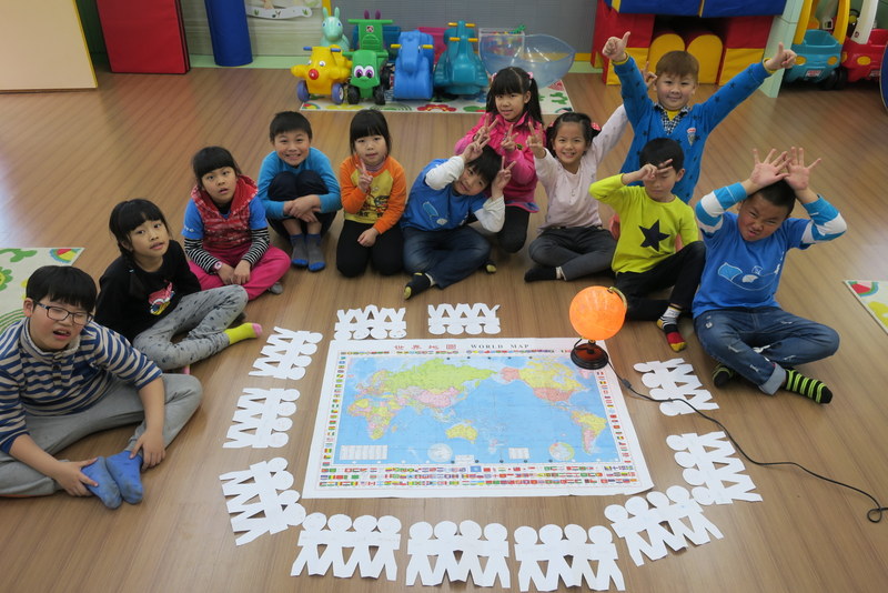 In honour of Children’s Day, celebrated in Taiwan on April 4, we were learning a little about children around the world. We used an excellent You Tube Video, Scenes From Schools Around the World and we learned the song, Hello to all the Children in the World – a great way to introduce the subject. At the end we made some cut-out children with the greetings in different languages written on them, and got each class together for a group photo….