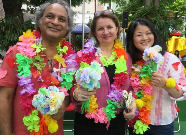 And what did we do all week? A tour of the St. James’ campus, meetings, classes, a lecture from Gerlinde ~ and meals with Rev. Charles Chen and MaryJo, our senior warden Samuel and supervisor Luanne, Preschool principal Susan, Language Institute director Yu-Mei, language teacher Jerry and his wife Jean, and St. James’ rector, Rev. Lily Chang (and we met her lovely 90-year-old mother too!), plus so many others. They met tons of people and enjoyed having fun with children of every age. Smiles and fun and laughter and of course, photos. Photos galore. For sure! Everyone at St. James was so happy to welcome them, and they were so gracious and kind and smiled all day at everyone! On Wednesday last week, Luanne also organised us all to go to Puli and Sun Moon Lake for the day, including the famous Puli ice-cream, mushroom farm and wine factory ~ and then TungHai University and Taichung City in the evening. Plus they went on a tour of the brand new theatre in Taichung (for Jerry’s account of that visit, see here). And for the grande finale, there was a farewell party on Thursday night, followed by a very lively visit to the night market ~ just don’t ask about that stinky tofu!