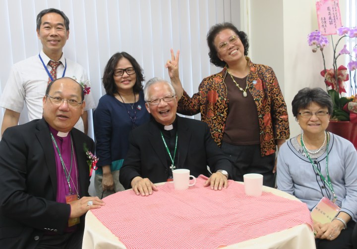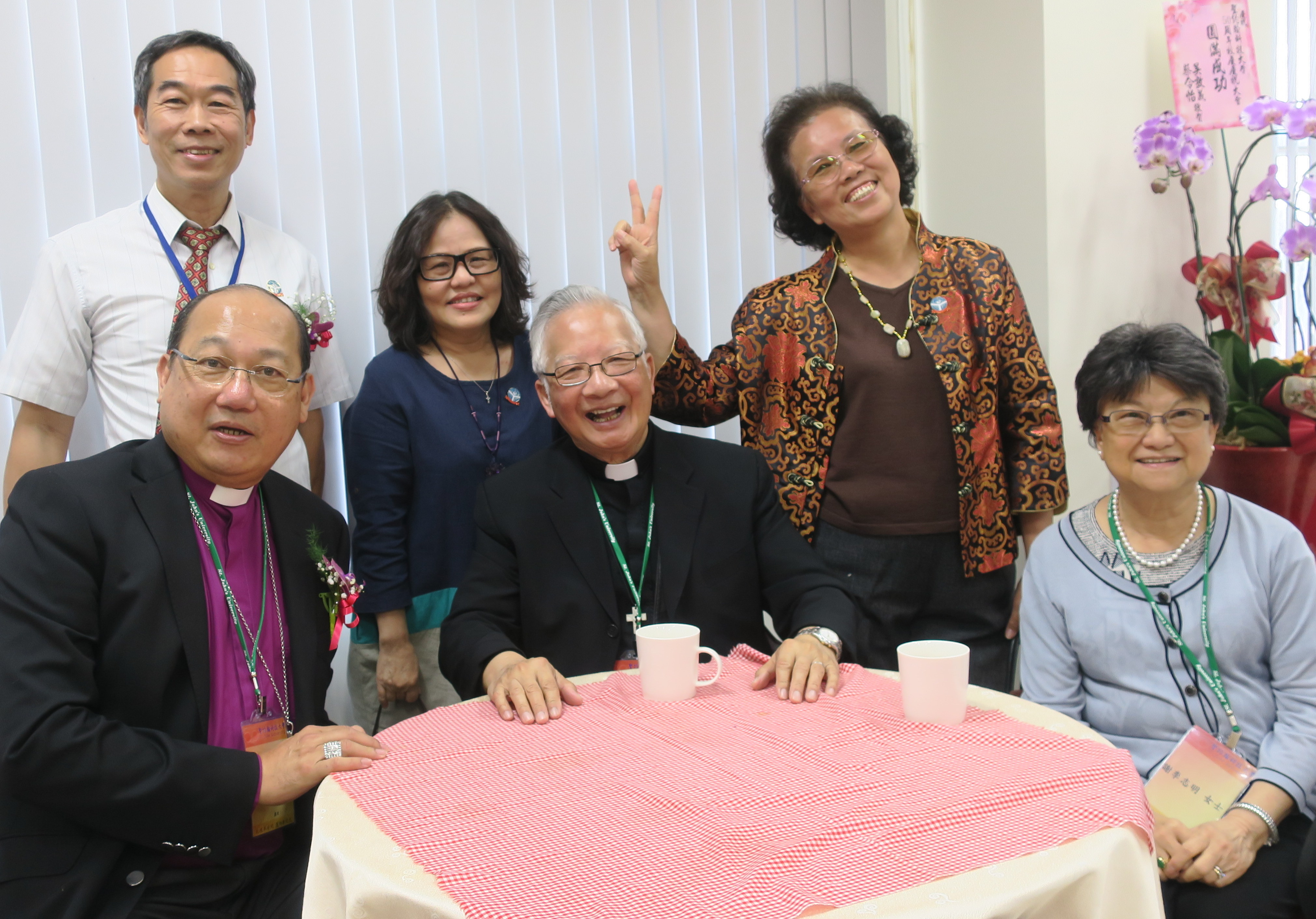 So we warmly welcomed a group of very sprightly and energetic alumni, all aged over 85, from the original St. John’s University, Shanghai, and the first group of alumni from SJSMIT, now mostly aged about 65, and also a reunion for those SJSMIT alumni who graduated 30 years ago this year. We welcomed representatives from our sister schools around the world too, many from Mainland China and Hong Kong. It was a special honour for us to welcome the Archbishop of Hong Kong, Paul Kwong (鄺保羅) who is also currently the chair of the Anglican Consultative Council, and Rev. Canon Edmund Der 謝博文法政牧師 and his wife Margaret, Mrs. Chee Ming Lee. Rev. Der was SJSMIT Vice-President from 1972-76. They are originally from Hong Kong, and their son, Rev. Matthias Der is dean of St. John’s Cathedral, Hong Kong. They have so many friends in Taiwan! Here they are, Archbishop Paul Kwong, Rev. and Mrs. Der seated, with 3 of their (and our) good friends, including Mrs. Chao and Ms. Liang…