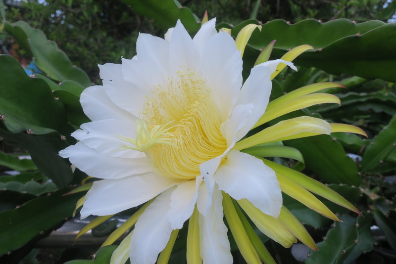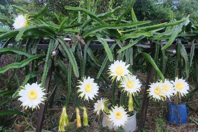 And if you’re up really early, you’ll get to see the flowering dragon fruits (pitahaya), which bloom overnight and wilt when the sun comes up. The flowers are huge, and attract bees…