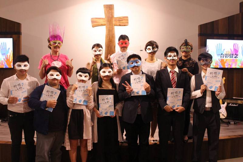 Last Thursday night, our student fellowship had a big farewell event for the 7 student fellowship members who are graduating. We all wore masks! Of the 7 students, 3 of the boys are student fellowship leaders, Pi-pi is last year’s chairperson, and En-Zhe and Bin-Huan also assist in the leadership ~ and all 3 are very much part of the praise and worship team. Their gift to the student fellowship was to publish a praise and worship book of favorite songs – some of which they had written themselves. Here’s the 7, with the chaplaincy team…. see they are all very smartly dressed, the boys in suits!