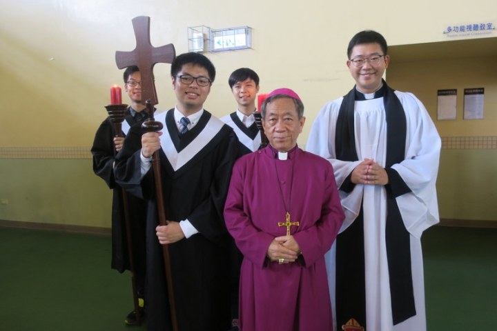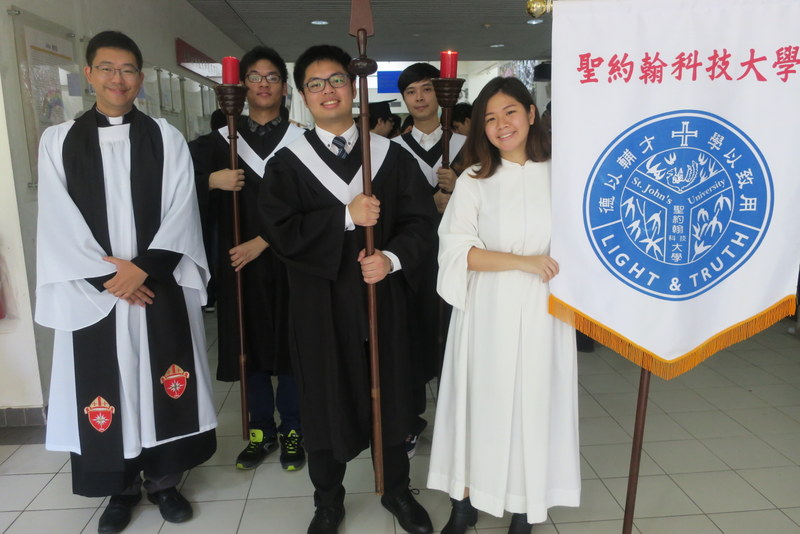 Our current student fellowship leader, Vincy carried the SJU banner at the head of the procession into the auditorium, and the 3 boys carried the cross and the candles. Bishop Lai came too.