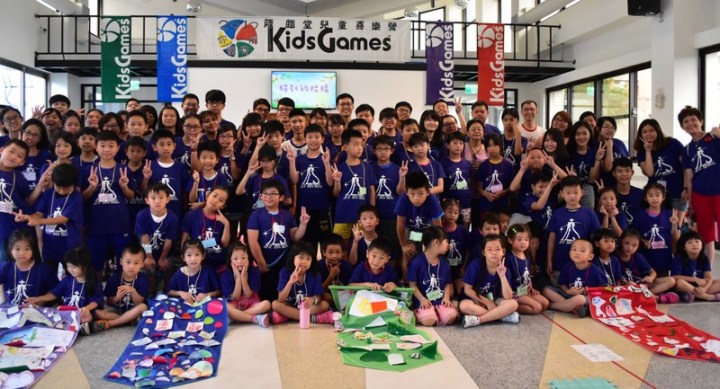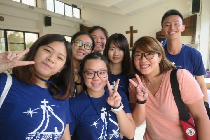 The summer camp happens every year at this time, with a large group of lovely students from our SJU Student Fellowship group who spend 2-3 days in training and preparation, followed by the actual camp, open to children aged from about 4-12. Once the children are too old to attend, then they can come along as helpers and attend the training too. So this year we had over 30 student leaders, and 55-60 children. The kids come from all over the local area, and some are children or relatives of our SJU faculty and staff and live further away. Two very small children had come from Yilan with their aunt, who is our school nurse ~ she said it was their first time away from their parents, and several had even come back from overseas to visit grandparents, so it was all quite international. Here we all are!