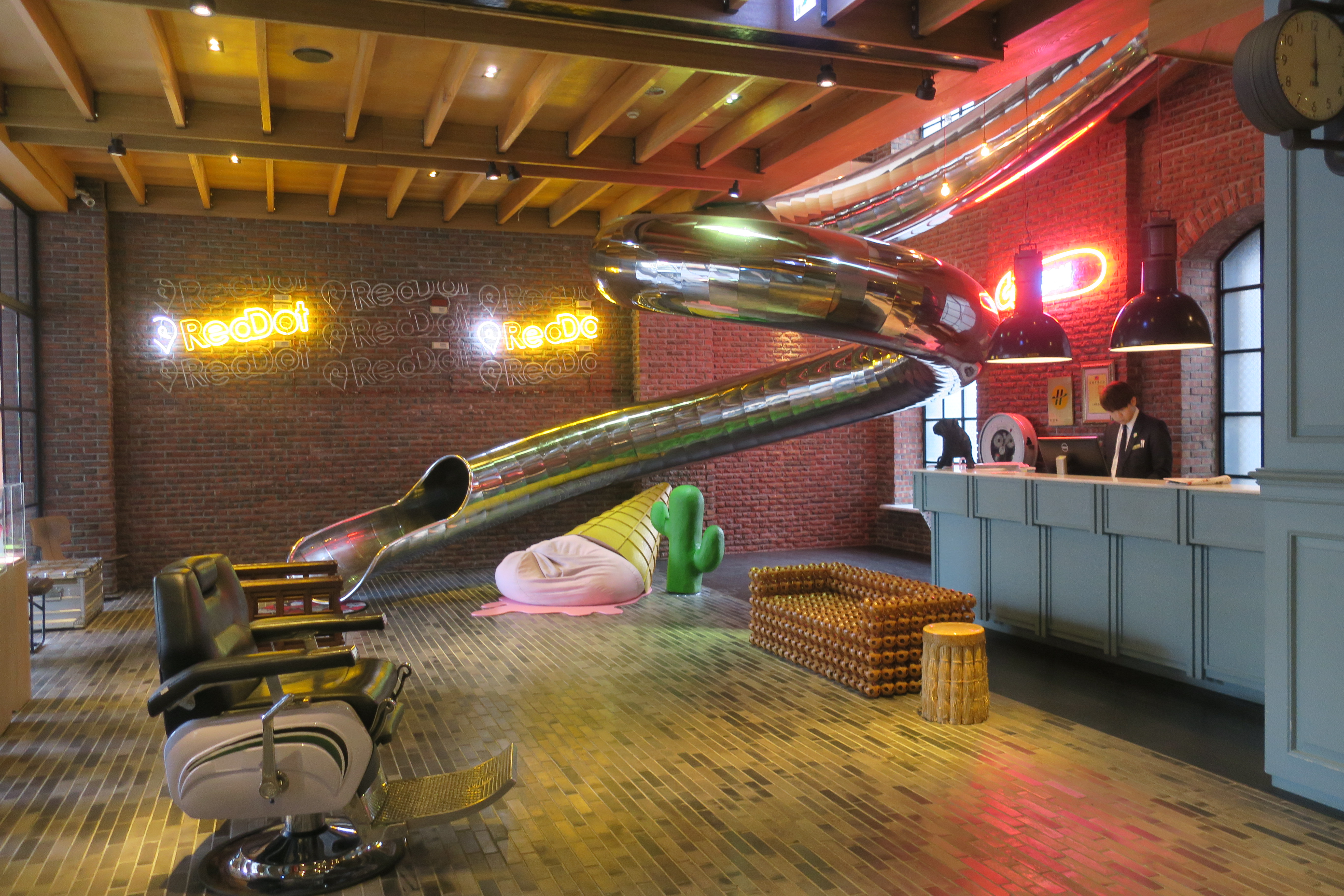 Then I passed the Red Dot Hotel, which has a large slide in the lobby for guests ….