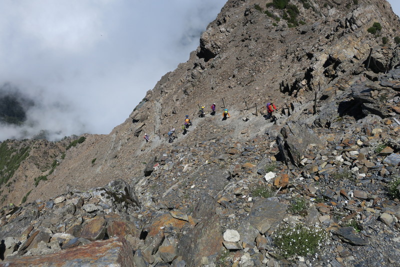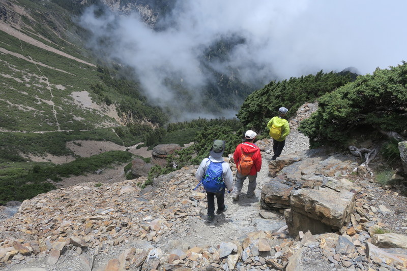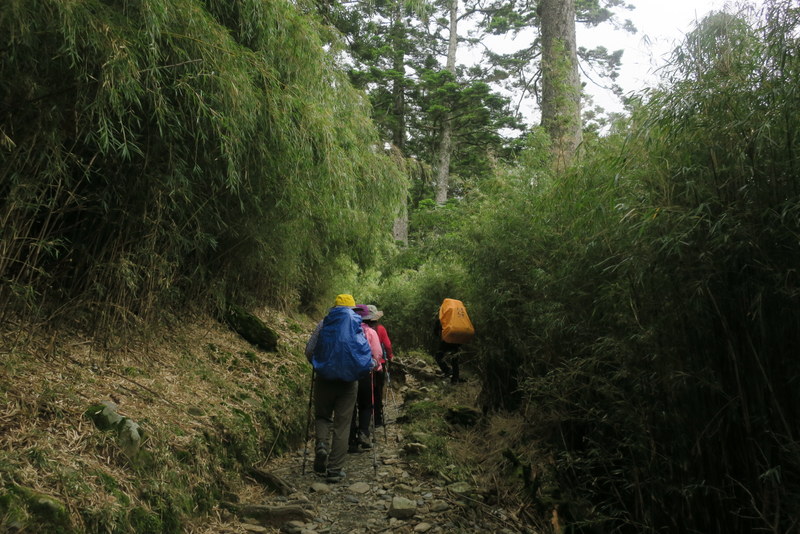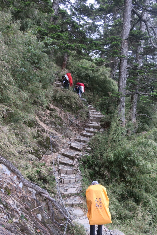And so back for breakfast and packing up. By then, the Central Weather Bureau had declared a sea warning for the typhoon, so after 8:30 am nobody could set off to climb to the summit. A few people came rushing up to Paiyun just in time to set off for the summit before the deadline came. They were trying to do the whole trek in one day rather than cancel altogether. No wonder they looked exhausted. And they would have had no views at the top, it was already clouding over as we started our descent.
