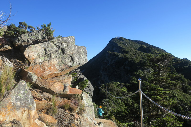 And so we arrived at the top of the ridge, Fengkou (‘Wind Mouth’) at 4:30 am. Glimpses of orange in the sky were appearing in the far distance. Everyone else was turning right for the final 200 m to the summit. But with zillions of people up there, we had already decided to head instead to the Yushan North Peak first. For us, this meant a STEEP Descent. Unbelievably steep. Felt like it was vertical. All scree and rocks. A fence with metal chains guided us down. By the time we were down there, it was daylight. Headlights off. A sigh of relief!