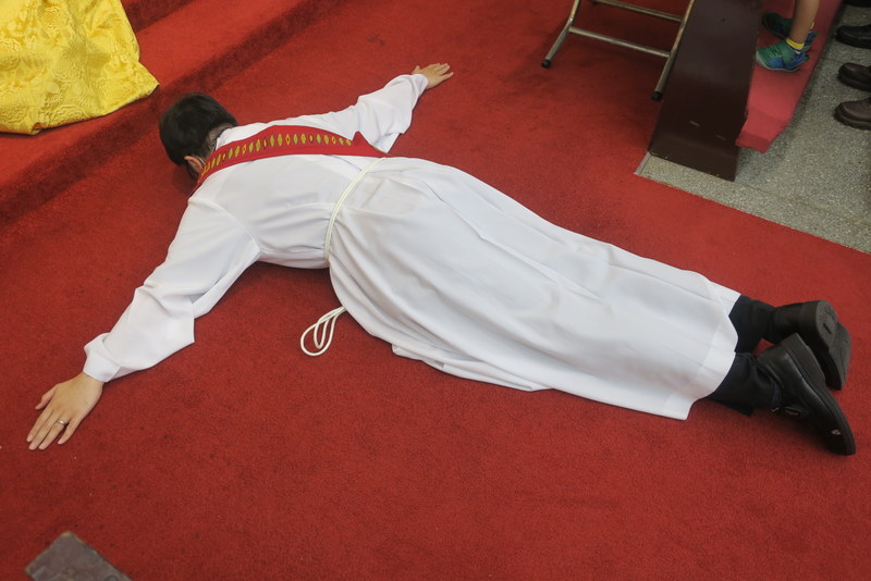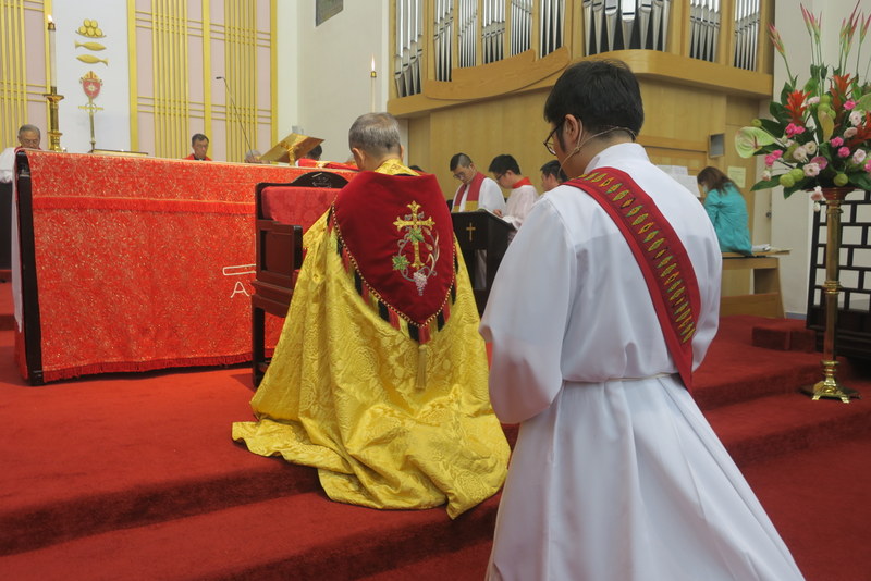 Exactly a year ago, on May 1, 2018, Antony was ordained deacon, also in St. John’s Cathedral, Taipei, by Bishop Lai (see that post and photos here). This time, as is the tradition for the ordination of a priest, all the clergy joined Bishop Lai in the laying on of hands…