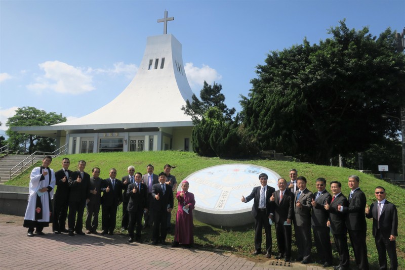 Actually the day had started at 9:00 am with a gathering of alumni of the former St. John’s and St. Mary’s Institute of Technology (SJSMIT) (original name of SJU) for the dedication by Bishop Lai of the newly-installed SJSMIT logo on the slope below Advent Church. For many years that logo was located in the floor of the main entrance to the central building. When the old buildings were demolished to make way for the new ones, the logo was moved to the SJSMIT archives and museum centre. Now it has been brought back once again into a more central place where it can be seen more easily by everyone.