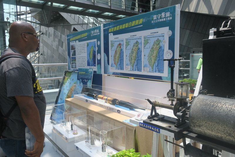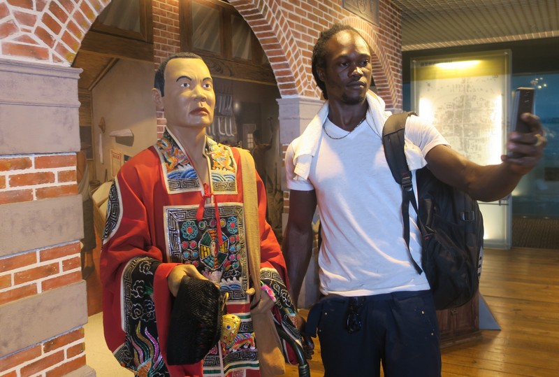 And so we joined them, but it took us 3 hours (yes, 3 whole hours!) from St. John’s University to get to our first main stop at Lanyang Museum ่ญ้ฝๅ็ฉ้คจ. The museum has really good displays about the local area, and gave us distant views through the haze over towards Guishan Island. Guishan Island (Turtle Island) is actually the protruding top of Taiwan’s only active volcano. Our friends from Latin America and Caribbean have plenty of active volcanoes in their own countries, so it’s good that Taiwan has one to show to visitors too! This is us at the museum…