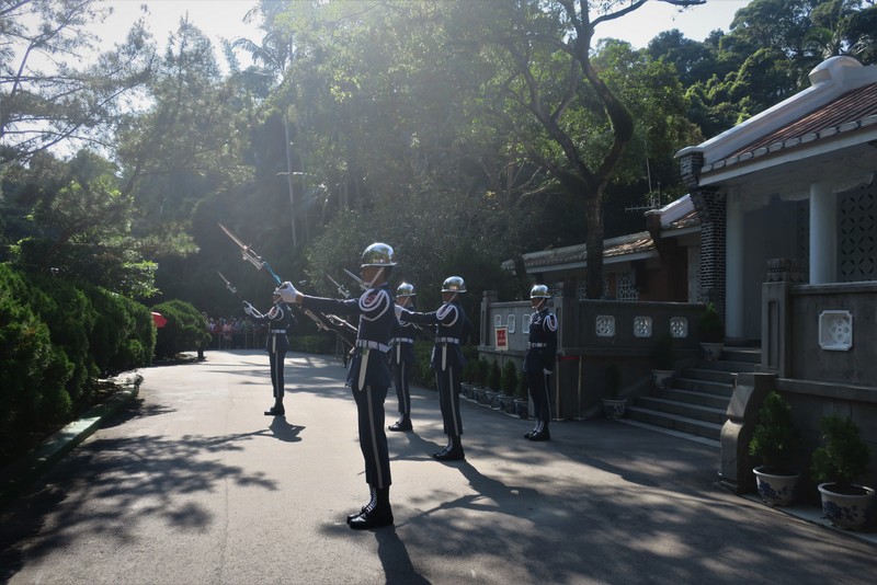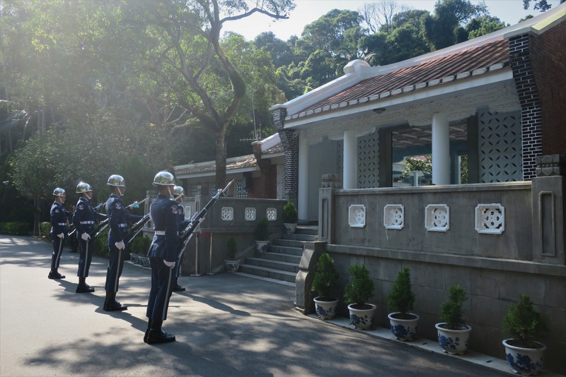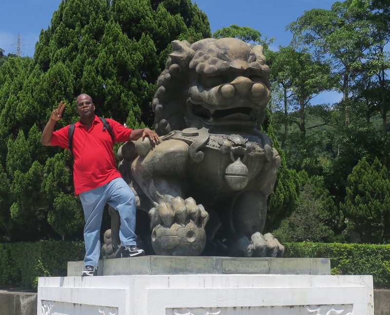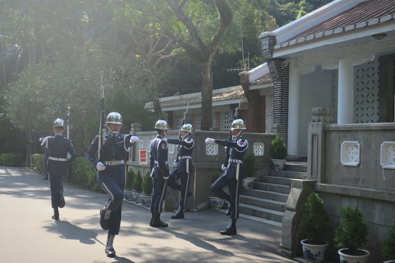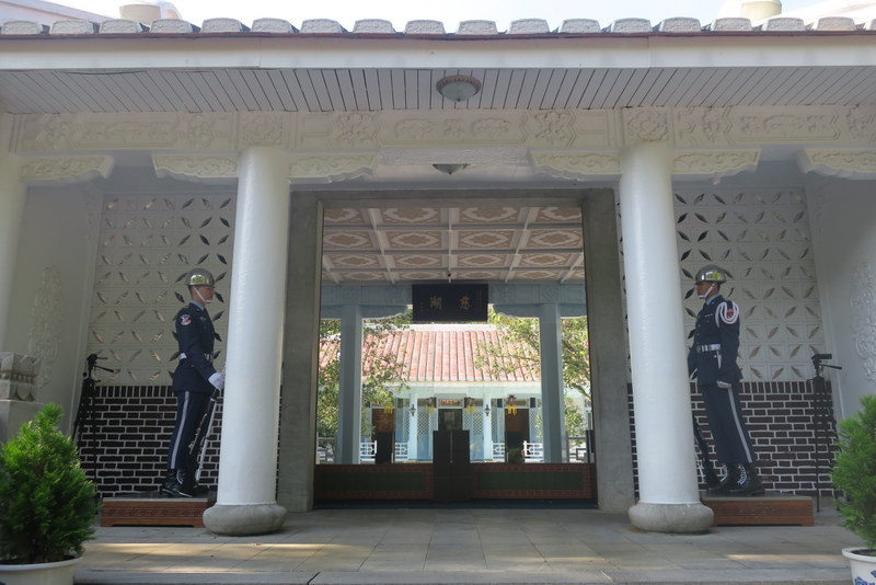And then to Cihu Mausoleum ๆ ๆน้ตๅฏข , “the temporary resting place of President Chiang Kai-shek. When Chiang Kai-shek died in 1975, he was not buried in the traditional Chinese fashion but entombed in a black marble sarcophagus since he expressed the wish to be eventually buried in his native Fenghua in Zhejiang province once the Kuomintang (KMT) recovered mainland China from the Communists.” We went to see the changing of the guard ceremony that takes place every hour on the hour ~ we were there for the one at 3:00 pm. Wow, it was so hot, bees were buzzing around and we were directly facing into the afternoon sun. But then the honor guard must have been even hotter, after standing for an hour in their heavy uniforms without moving….