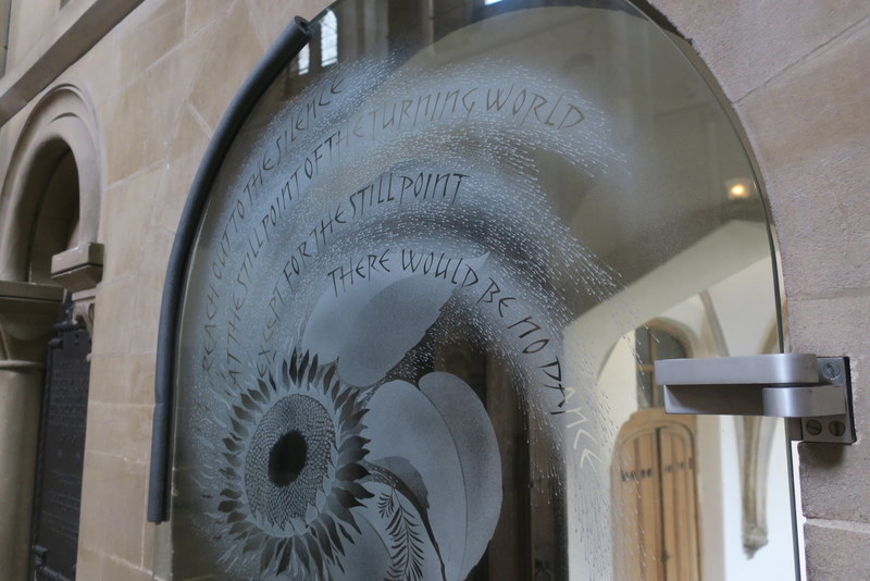 Such is our ‘turning world’ of earthquakes, typhoons and political crises. Finding the ‘still point’ is a challenge. T. S. Eliot’s words have been adapted by David Peace and Sally Scott (1989) and engraved on the glass door of St. Catherine’s Chapel in Norwich Cathedral: “Reach out to the silence at the still point of the turning world / Except for the still point, there would be no dance / Love is itself unmoving / only the cause and end of movement / timeless”. It also illustrates the lines, “Will the sunflower turn to us, will the clematis / Stray down, bend to us; tendril and spray / Clutch and cling”, the illustration showing how the sunflower and clematis grow towards the light, that is ‘at the still point of the turning world’. I visited Norwich Cathedral last year, and loved that engraving on the door.