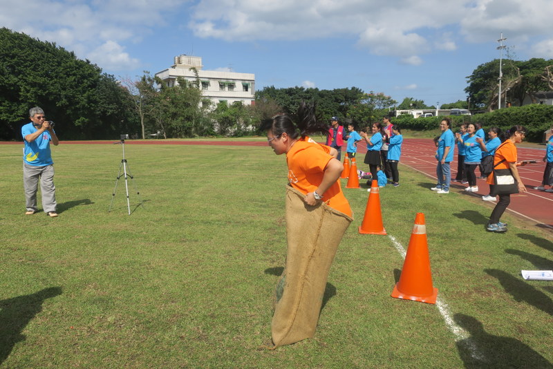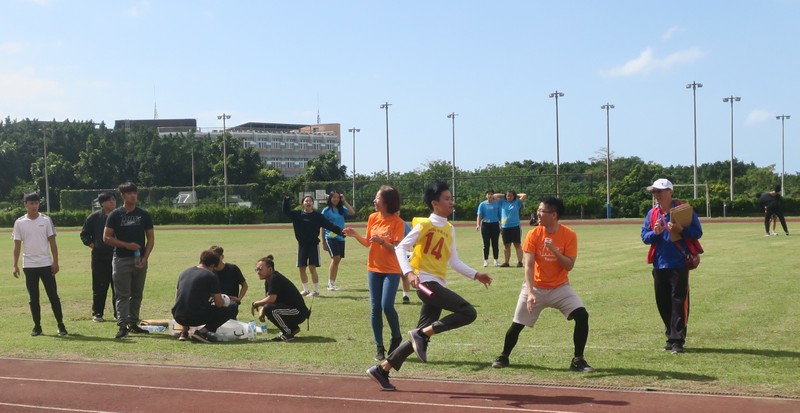 The bishop of the Taiwan Episcopal Church, Bishop David J. H. Lai has always made the ecumenical Sports Day a big priority and he attends every year, competing in the Table Tennis competition, and this year was no exception. Participation by different churches over the years comes and goes ~ this year there were 6 teams in total, from the RC Church, Taiwan Christian Service, YMCA, YWCA, Episcopal Church and a small team of 9 from the Presbyterian Church. Some years, the Roman Catholics and Presbyterians choose to participate in big numbers – their indigenous church members are so strong and always win every tug of war race with one slight jolt on the rope (at least, that’s my impression of the last time the Sports Day was held here at SJU, back in 2012!) The team with the most colourful T-shirts were in bright orange – despite their name, the YMCA (Young Men’s Christian Organization) had almost equal numbers of men and women, and on inquiry they said that they were all working at the YMCA Hotel in Taipei – I told them we always recommend their hotel to visitors – it’s a good place!