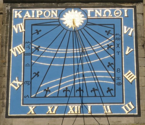 The sundial at Ely Cathedral. The Greek words at the top read ‘Kairon Gnothi’, meaning ‘Choose the timely moment’.
