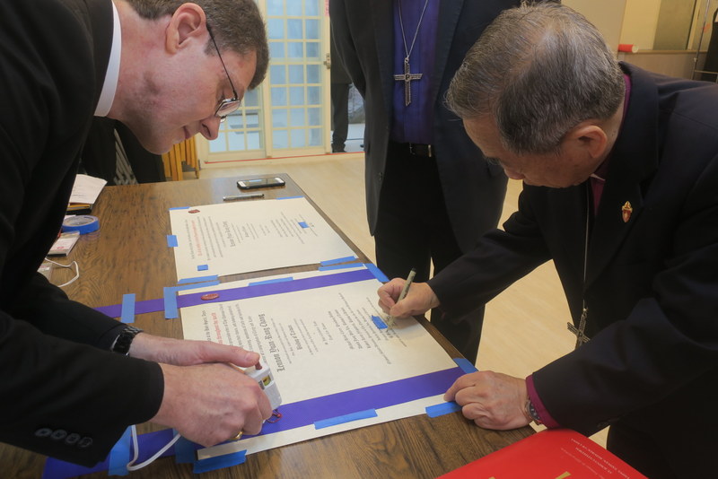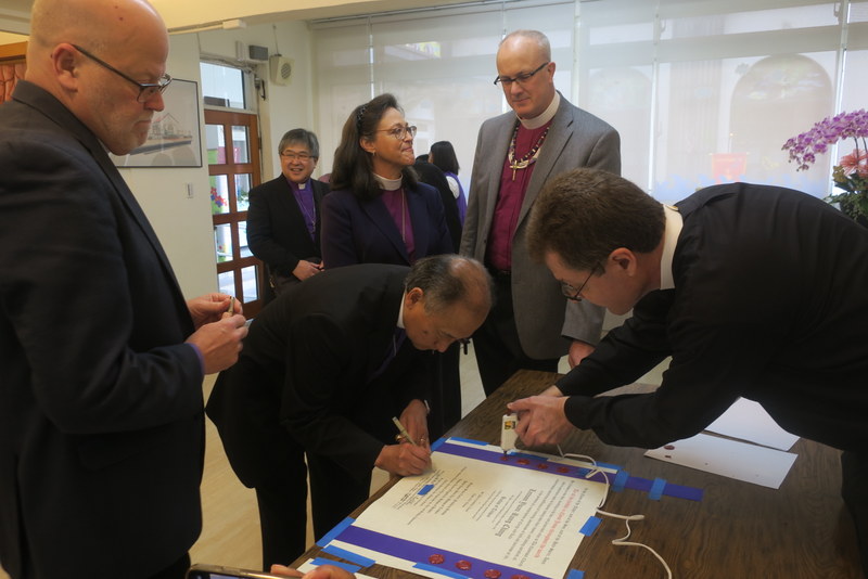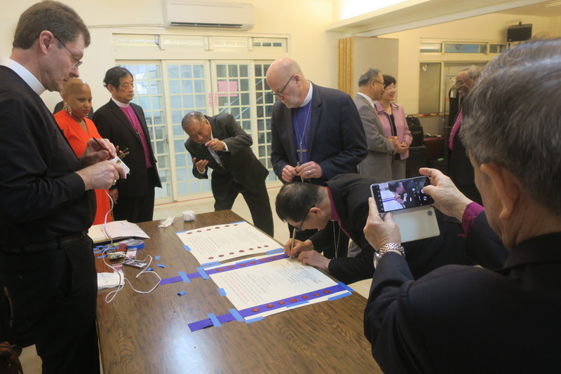 Fourteen bishops signed and sealed the ordination certificate, those mentioned in the article above, plus other Province VIII bishops: Bishop Megan Traquair of N. California, Bishop Gretchen Rehberg of Spokane, Bishop Scott Hayashi of Utah, Bishop Mark Lattime of Alaska and Bishop Suffragan Diane Bruce of Los Angeles, who is also secretary of the House of Bishops and who read one of the testimonials in the service – in Mandarin Chinese! The Province VIII bishops had arrived earlier in the week to hold a meeting from February 19-21. For Bishop Greg Rickel’s account of his visit to Taiwan for the consecration, see his blog post here. These are the bishops who were at the consecration service, along with the retired RC Archbishop of Taipei and bishops from the Methodist and Lutheran Churches in Taiwan…