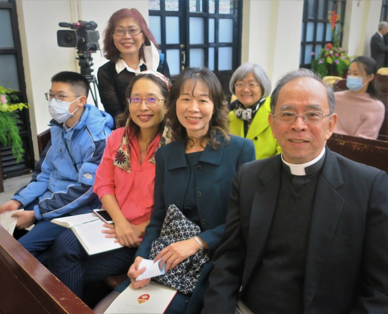 Mrs. Amy B. H. Lin was a key leader in the consecration committee, in charge of the reception, the welcome dinner, transport for the Presiding Bishop and his team, and the ushers at the service. Mr. Di Yun-Hung helped too. The ushers were really well-coordinated and well-organized, keeping an eye on the congregation as well as making sure everyone had their temperatures checked on arrival, and hands sprayed with sanitizer. (The clergy had made the decision that they and all those in the procession would not wear face-masks for the service, but for the congregation, it was a personal decision). Amy was invaluable, as always, and much of the success of the whole event was due to her organization and coordination. This photo was taken at the welcome dinner, Amy is 4th from the left next to Linda, wife of the cathedral dean, Philip Lin.