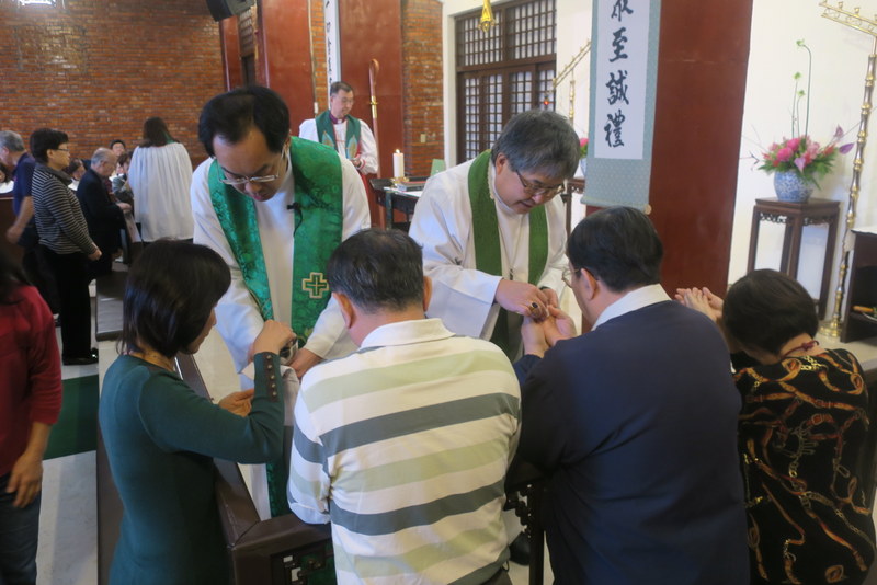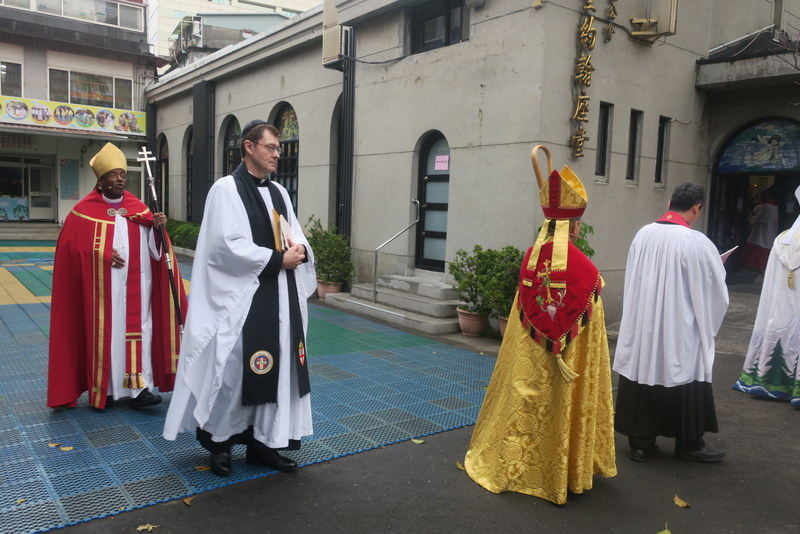 After the consecration service on Saturday, everyone was talking about how beautiful the service was, such a grand occasion and so well-choreographed. Much of the credit for that must go to Canon Mark, but he himself said it was largely due to Rev. Lily L. L. Chang, rector of St. James’ Episcopal Church, Taichung. She was the very hard-working chair of the liturgy and music section of the consecration committee, helped considerably by the other members, Rev. Keith C. C. Lee, Rev. Simon T. H. Tsou, Very Rev. Philip L. F. Lin, Rev. Antony F. W. Liang and Mrs. Amy Chee. The consecration booklet they produced in both Chinese and English was extremely comprehensive, and the list of all those who participated was very extensive. The music was amazing, the combined choir from St. John’s Cathedral, Advent Church and Good Shepherd had been practicing for weeks. The choir sang from the cathedral balcony and they were wonderful!