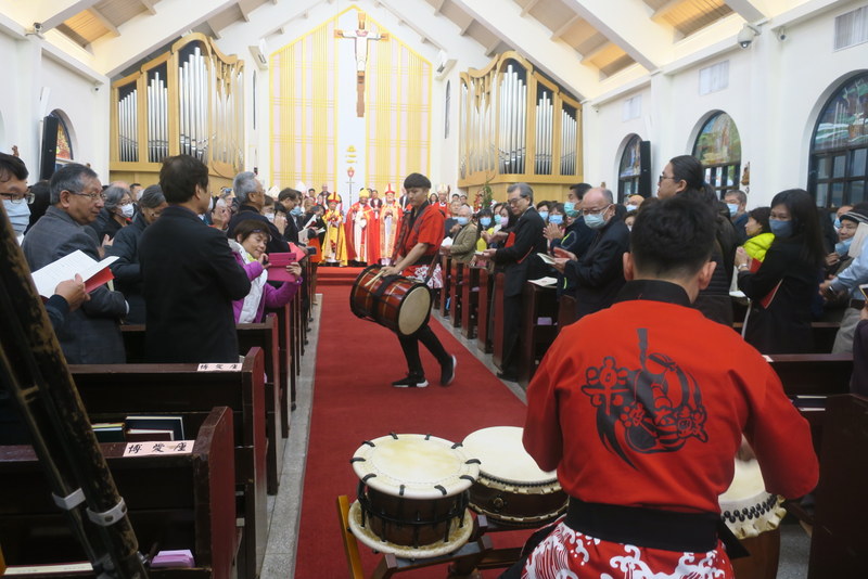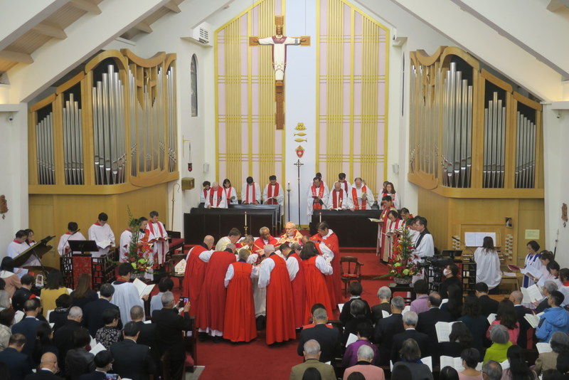 Despite growing concerns about the coronavirus outbreak, it was considered safe to continue with the consecration service, although the evening’s consecration banquet was canceled and travel restrictions meant that the archbishop and bishops of Hong Kong were unable to participate. The service was performed in Mandarin Chinese and English, and Curry led the service as chief consecrator. The co-consecrators were Bishop David J. H. Lai of Taiwan, Bishop Robert Fitzpatrick of Hawaii, Archbishop and Primate of Japan Nathaniel Uematsu, Bishop Haruhisa Iso of Osaka (Taiwan’s companion diocese) and Bishop Greg Rickel of Olympia. Archbishop and Primate of Korea Moses Yoo, Bishop Todd Ousley of the presiding bishop’s staff, Bishop John Smylie of Wyoming, most of the Province VIII bishops and a group of 15 clergy and church members from the Diocese of Osaka gave the service a special international flavor. Clergy stoles, flowers and decorations were all in traditional Chinese red, while firecrackers and a taiko drum performance enlivened the celebrations during the service, as did the combined choir from three Taipei churches.