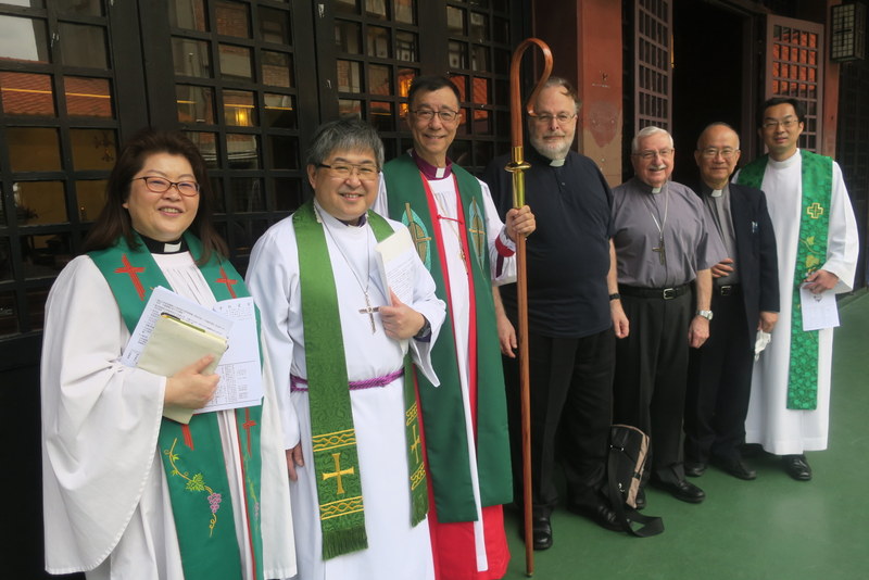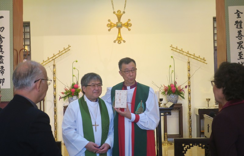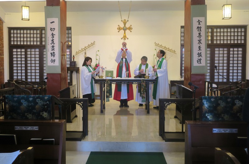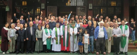 For Bishop Chang it was most appropriate that he should start his new ministry as bishop at Good Shepherd, as that was the church where he was ordained deacon in 1995. Bishop Iso preached and the rector, Rev Keith C. C. Lee translated. The Gospel was read in Japanese by Rev. Kiyomi Semmatsu from Osaka, and in Chinese by Keith Lee. Keith is able to preach in 4 languages, Mandarin Chinese, Taiwanese, English and Japanese; so he’s a really valuable person to have around! At the end of the service, Bishop Chang presented gifts to Bishop Iso, Rev. Iwaki and his wife, and Ms. Chao Wen-Yi, our former colleague in the St. John’s University Chaplaincy for many years, whose 70th birthday was on Sunday – and what a special way to celebrate!