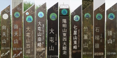 On each of the summits, there is a marker post, and on the top of each post is a Chinese character in metal ~ use a pencil and paper to do like a brass rubbing (or just take a photo!) Put together in order and these characters make a phrase. The 10 Chinese characters are: Mt. Ding (“陽”), Mt. Shiti (“明”), Jixinlun (“山”), Mt. Qixing East Peak (“東”), Mt. Qixing Main Peak (“西”), Mt. Datun Main Peak (“大”), Mt. Datun South Peak (“縱”), Mt. Datun West Peak (“走”), Mt. Miantian (“活”), and Mt. Xiangtian (“動”). The whole phrase, 陽明山東西大縱走活動 translates as the ‘Yang-Ming Shan East-West Vertical Traverse Activity’. These are the 10 summit posts (left to right in the order I did them), though with Mt Zhugao instead of Jixinlun ….