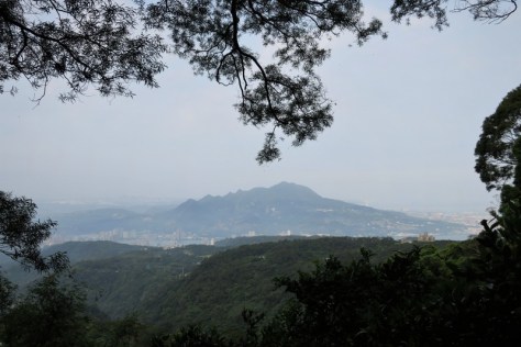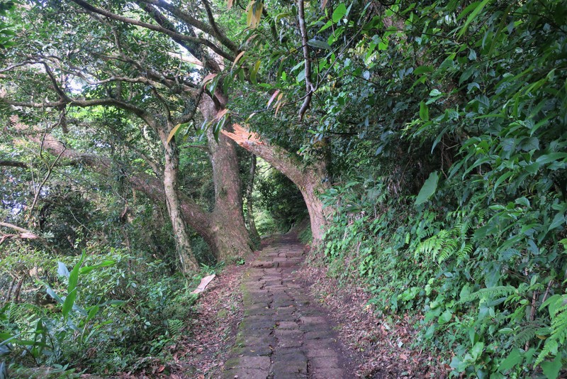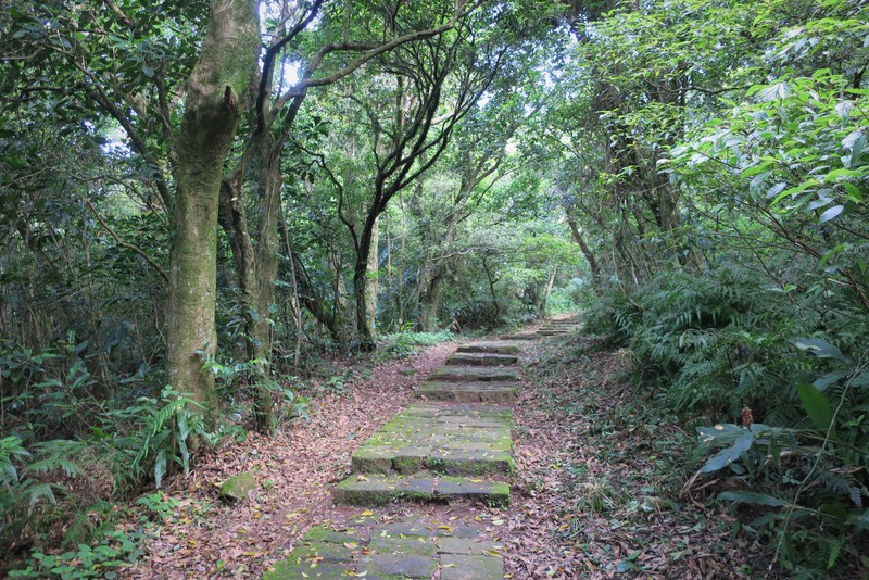 So all in all, I think it’s better to start at the west end of the hike, which is at Qingtian Temple 清天宮登山口 and walk eastwards. The bus you need is the S6 (小6) bus from Beitou MRT, and there are lots of buses all day long, and lots of people on a weekend all queuing for the early buses! Get there early. The earliest I could get to Qingtian Temple on Saturday was at 7:15 am. Qingtian Temple village has a temple or two, a public toilet and a large noticeboard with a map. The whole trail is very well-signposted as long as you know the order of the mountains. The trails on Yang-Ming Shan were mostly built in the Japanese Era, and they were built to last forever, mostly of stone. This is the view from Qingtian Temple Trail-head over towards Guanyinshan…