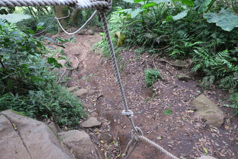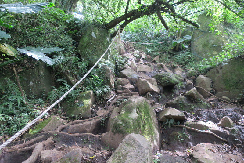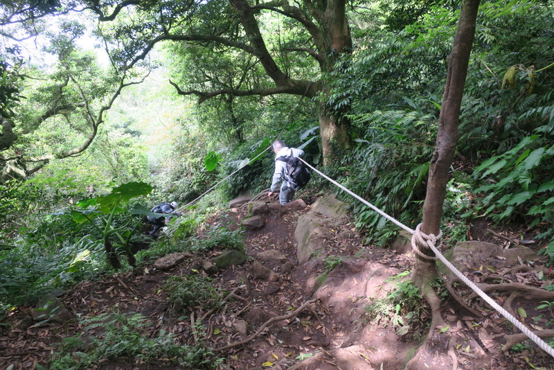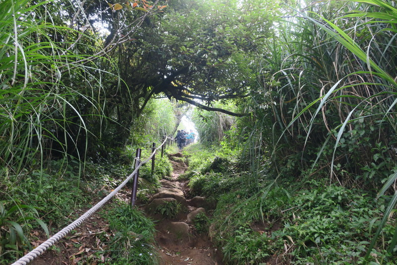 Taking the path straight down from Mt. Miantian leads back to the main path. Turn right for about 10 minutes heading to Miantianping 面天坪, where there’s a pavilion always full of people enjoying a day out. The path up to Mt. Datun West and South Peaks (and eventually to Mt. Datun Main Peak) starts here, on the left. The Datun Mountain range 大屯山 lies ahead. This is the steepest part of the whole hike coming up. Bring some cheap gloves to cling onto the fixed ropes that are provided to help you haul yourself up and down. Yesterday it was very slippery, and without ropes would have been a nightmare. But be prepared for aching arms and shoulders!