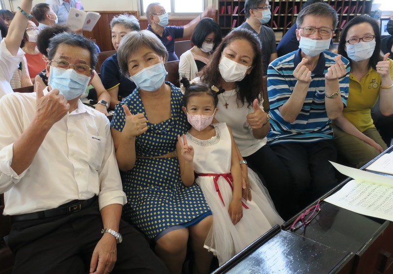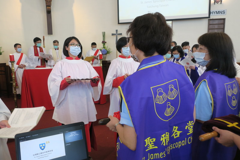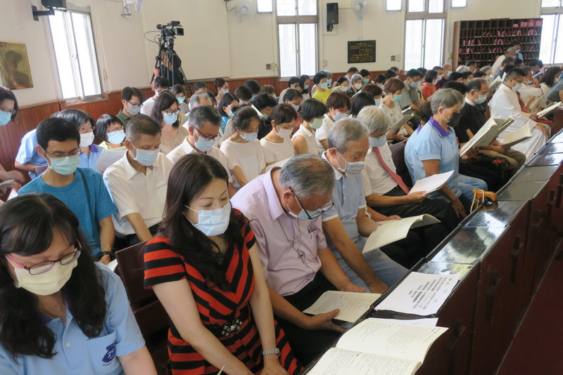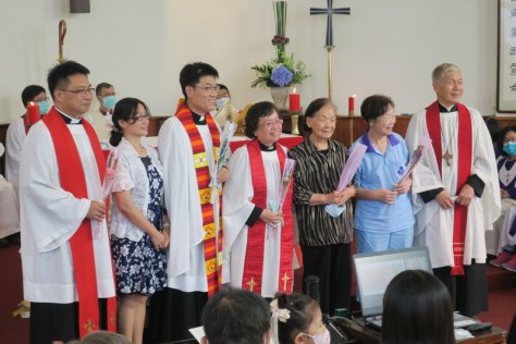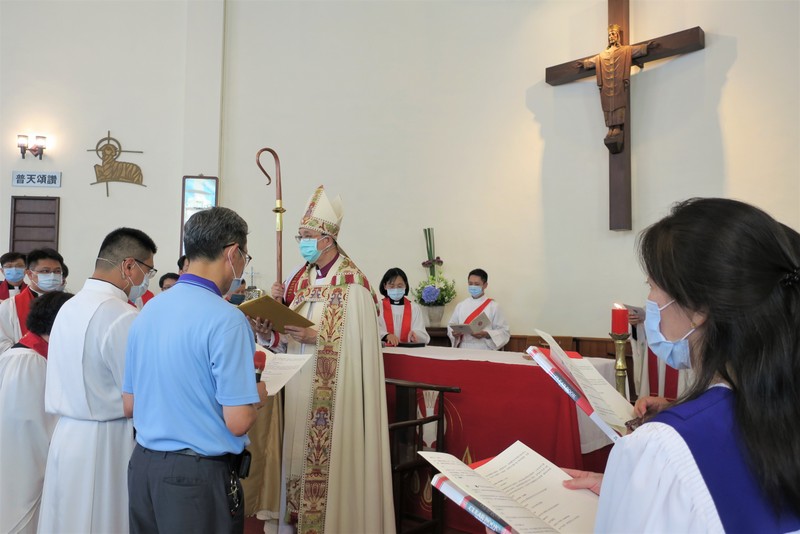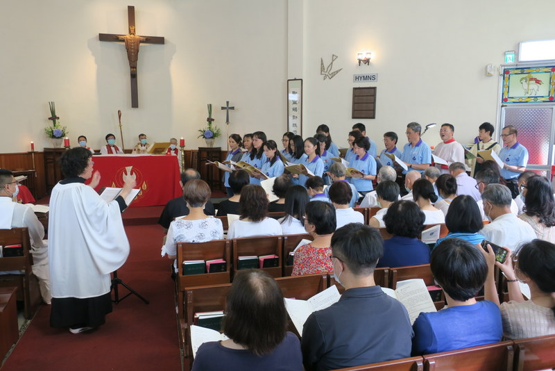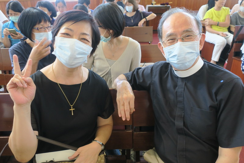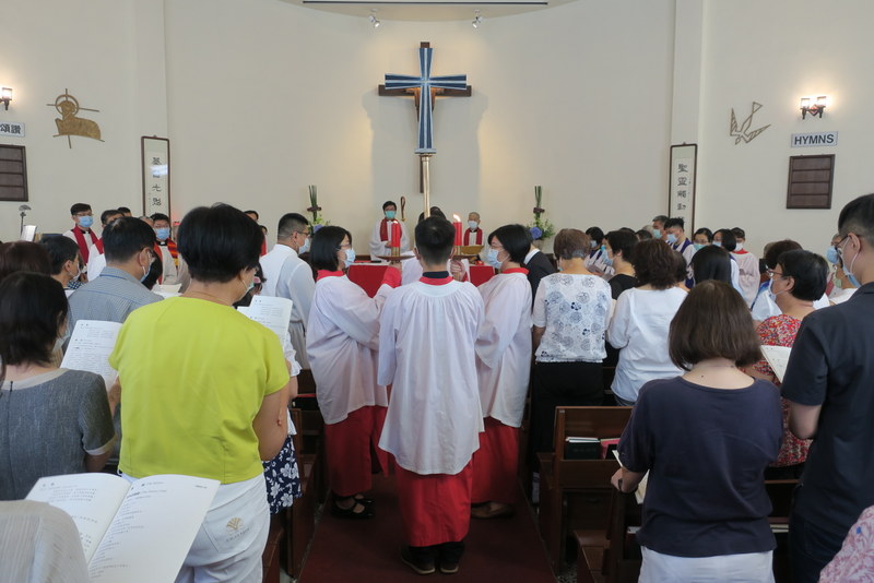 The service was at 3:00 pm, and would you believe it, all of us traveling there by road got caught in major traffic jams all the way down from Taipei. What should have been a 2½ hour journey for us from Tamsui turned into 4¼ hours, and most others had the same experience. ‘Never again’ we vowed as rushed to get to the rehearsal on time, but by the end of the day, going home, we were all so full of praise for the way everything had gone so smoothly, so well-managed and organized, that we’d forgotten about the traffic in the morning! However, it was extremely hot, and the poor clergy and bishop struggled in all those robes – in the heat outside for photos but also inside the church at the front. There were so many people inside that the AC was struggling too! Taking precautions due to Covid-19, everyone had their temperatures checked, and wore face-masks inside the church – which made it extra-hot.