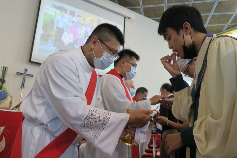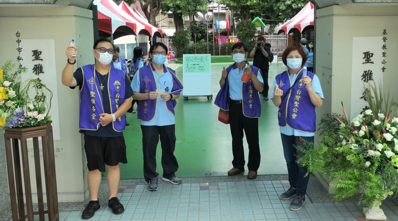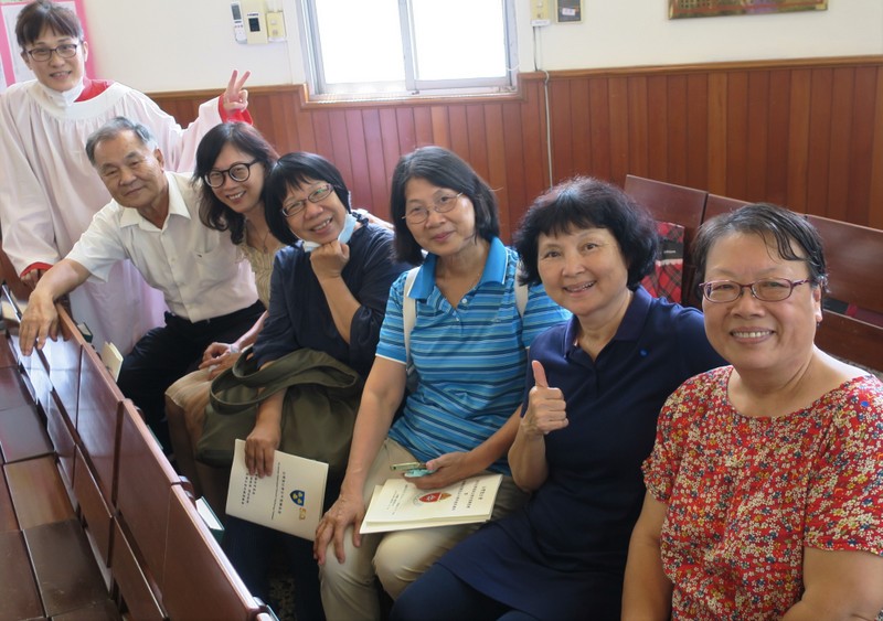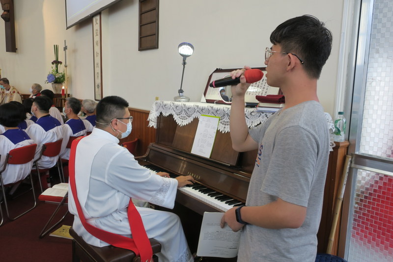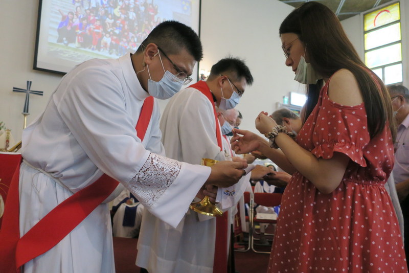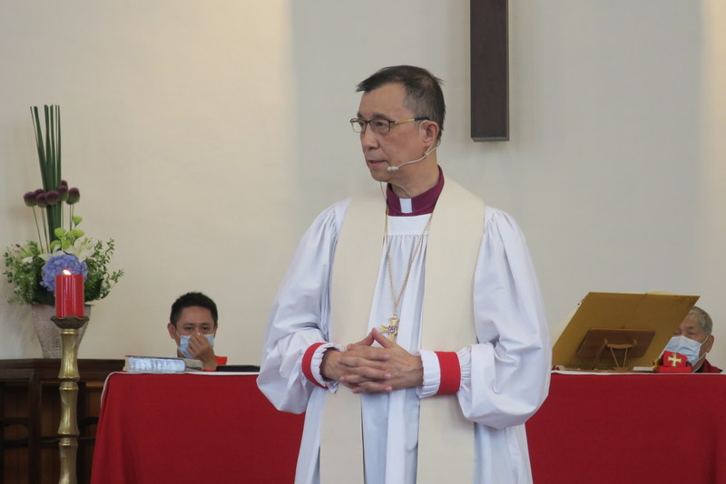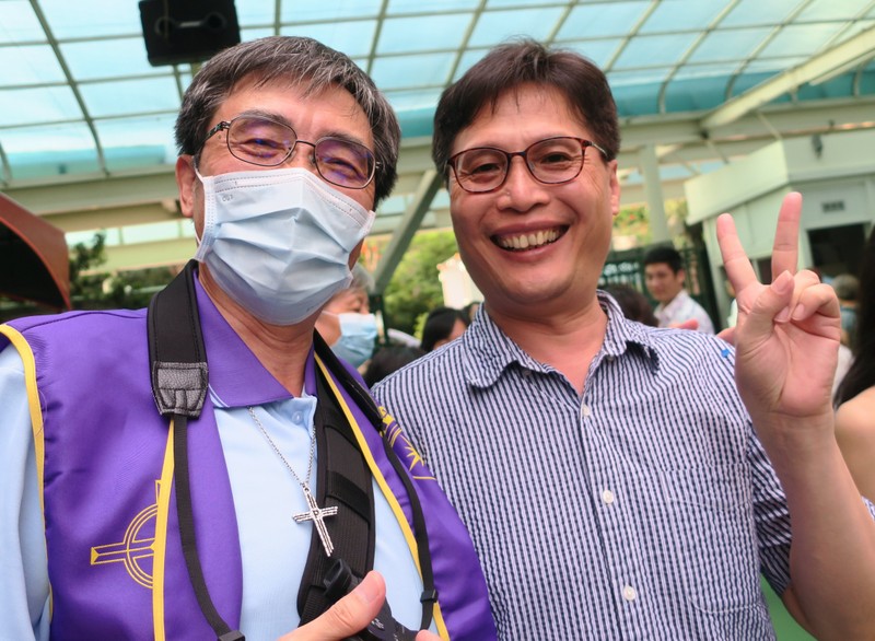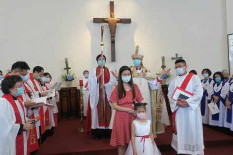 The service was at 3:00 pm, and would you believe it, all of us traveling there by road got caught in major traffic jams all the way down from Taipei. What should have been a 2½ hour journey for us from Tamsui turned into 4¼ hours, and most others had the same experience. ‘Never again’ we vowed as rushed to get to the rehearsal on time, but by the end of the day, going home, we were all so full of praise for the way everything had gone so smoothly, so well-managed and organized, that we’d forgotten about the traffic in the morning! However, it was extremely hot, and the poor clergy and bishop struggled in all those robes – in the heat outside for photos but also inside the church at the front. There were so many people inside that the AC was struggling too! Taking precautions due to Covid-19, everyone had their temperatures checked, and wore face-masks inside the church – which made it extra-hot.