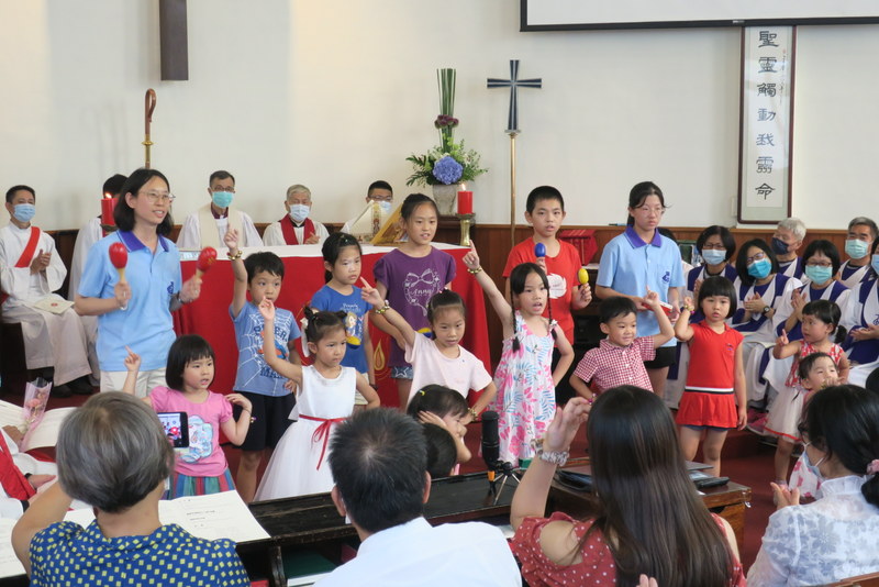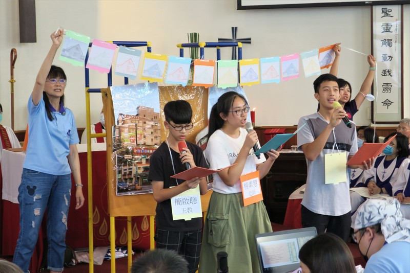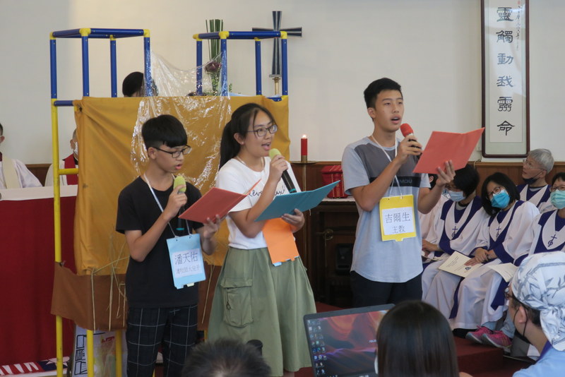 Chia-Kuei graduated from the seminary at Fu-Jen RC University, Taipei last year, and has been assigned to St. James’ Church (under rector Rev. Lily Chang) full-time ever since then, having been on placement there at weekends for his final year of theological college. He is actually based at the Church of the Leading Star, St. James’ daughter church in Taiping, about 30 minutes’ drive away on the outskirts of Taichung City at the foot of the mountains, though he serves in both churches. On Trinity Sunday, Sunday services were restarted at the Church of the Leading Star after a gap of a few years, this time with Chia-Kuei leading Morning Prayer, with a monthly Holy Communion led by Rev. Lily Chang. The church has long had a small kindergarten which has a valuable ministry in the area, and some of the kindergarten families have started to worship in the new Sunday service. It’s not an easy area in which to live, badly affected by a major earthquake in 1999, the booming high-rise city development that characterizes much of the rest of Taichung has bypassed Taiping, leaving quite a depressed area, with many disadvantaged families and a lot of small struggling factories. Children’s summer camps are always popular there, and last week, Chia-Kuei and his team welcomed 55 children for 2 days of fun activities. Chia-Kuei also leads the St. James’ Youth Group and many of them were involved in the camp – and in the service on Saturday, in the drama and singing…