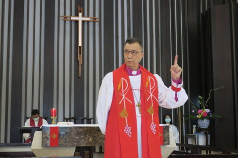 On this day 55 years ago, October 23, 1965, the Ground-Breaking Ceremony for the new SJSMIT construction was held, and building work began. Money was very scarce and it was extremely hard work for Bishop Wong to raise the funds needed to construct all the buildings and pay the salaries, the stress of which is believed to have contributed to his early death. Bishop Wong’s famous motto and the driving force behind setting up SJSMIT was always, ‘以基督得勝的生命影響生命’, translated as “Transforming Lives through the Life of Christ’. This has also been a major influence on the life and witness of Bishop Chang himself, and of many students and alumni of SJU over the years. Today is also the day when the church commemorates St. James of Jerusalem (brother of Jesus, who died a martyr in AD 62 or 69) so the liturgical colour of the day was red.