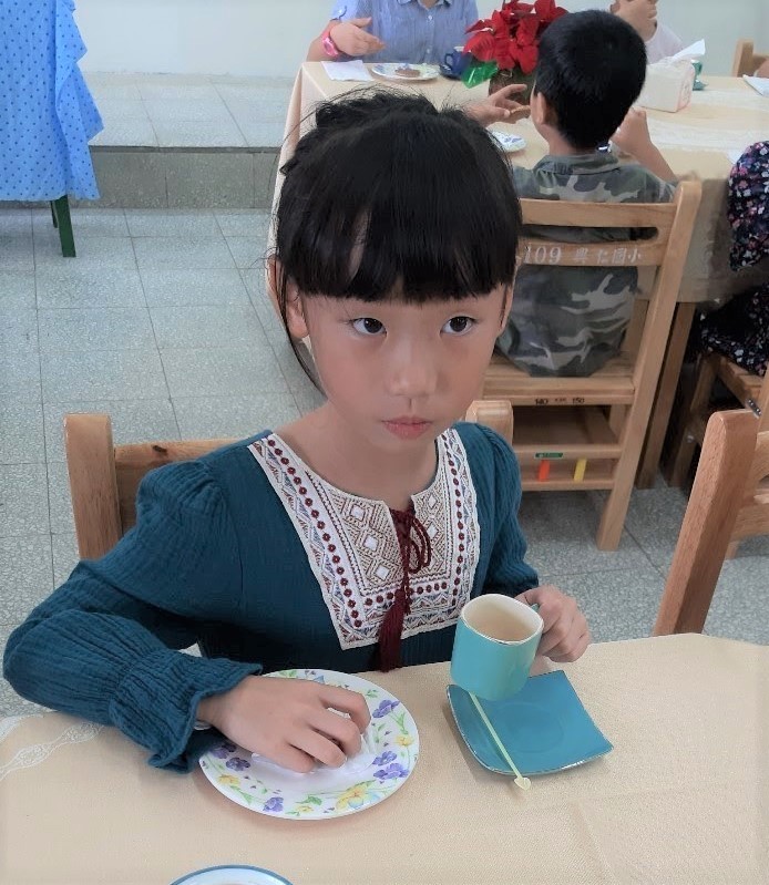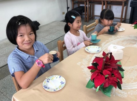 And that’s what I was doing at Xingren Elementary School (新北市淡水區興仁國小) last Friday, November 20. Starting at 8:30 am, all 6 classes, Grades 1-6, each came for 40 minutes each, all dressed up in their best outfits (me too!), and we drank tea together from dainty little tea cups and had chocolate biscuits. Fortunately Carrefour in Tamsui sells PG Tips and McVities chocolate digestives (labelled “Imported from the UK”), so it’s perfect. No cucumber sandwiches or cream scones, but hey, it was great! Such a simple thing to do, but such fun, and everyone was so happy – and the kids were so well-behaved! The principal came for one of the classes too. We learned how to sit and not slouch, to stir and not slop, to sip and not slurp ~ ladies and gentlemen in the making! And we learned a whole lot of English too, like, ‘Would you like some milk?’ ‘Is the tea good?’ ‘It’s delicious!’ ‘Would you like some more tea?’ ‘Yes, please’ and ‘No, thank you’.