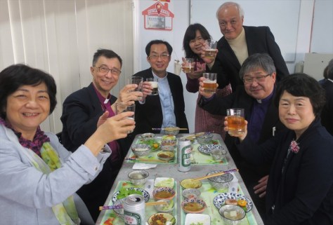 Here’s to Taiwan and Osaka, companion dioceses now for 15 years! Bishop Haruhisa Iso and his wife from Osaka, Japan (right) and Bishop Lennon Y. R. Chang and his wife Hannah (left), welcomed by Rev. Keith C. C. Lee, Mr. Jake Hung and his wife, Shiao-Ping to Good Shepherd Church, Taipei, the day after Bishop Chang’s consecration, February 23, 2020.