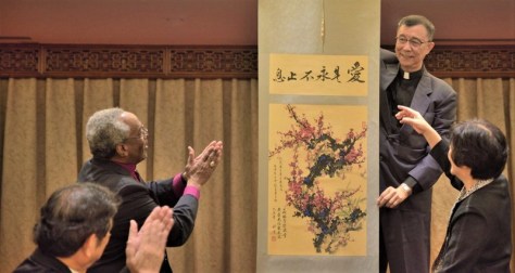 Presentation from then Bishop-Elect Lennon Yuan-Rung Chang to Presiding Bishop Michael Curry on the eve of his consecration, February 21, 2020 ~ the gift of a traditional Chinese scroll, specially commissioned for the occasion by one of Bishop Chang’s former classmates. The words at the top of the actual scroll read right to left ~ here written left to right: 愛是永不止息 from 1 Cor. 13:8, translated as ‘Love never fails.’