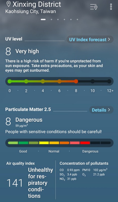Just to set the scene, Kaohsiung is south Taiwan’s largest city and Taiwan’s main port. It’s extremely hot and sultry all summer, and very mild and muggy all winter. Pollution is a major problem and the air quality over the weekend was terrible – and with no breeze, so there was haze in all directions. Famous for its shipbuilding, steelworks, heavy industry, oil refineries, port and manufacturing, it doesn’t sound like a very attractive place. These were the air quality readings for last Friday…