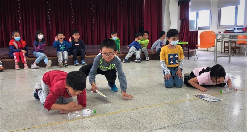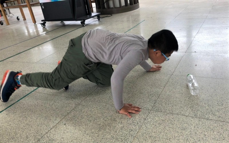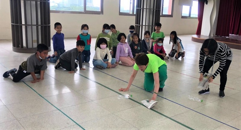 Green is the colour for Earth Day, of course! So here I am at our local elementary school all in green, for a day of fun and games with all 6 classes of children (photos taken by the school for their website). We were reusing empty plastic water bottles, and trying to get them across to the other side of the room by any means – but without touching them. It’s much harder than it looks, I can tell you!