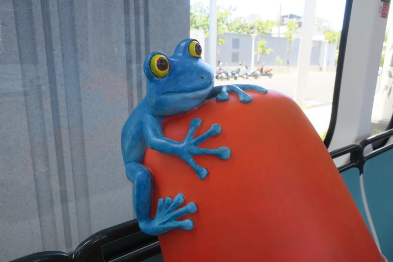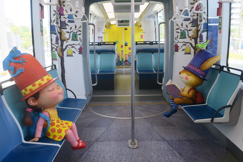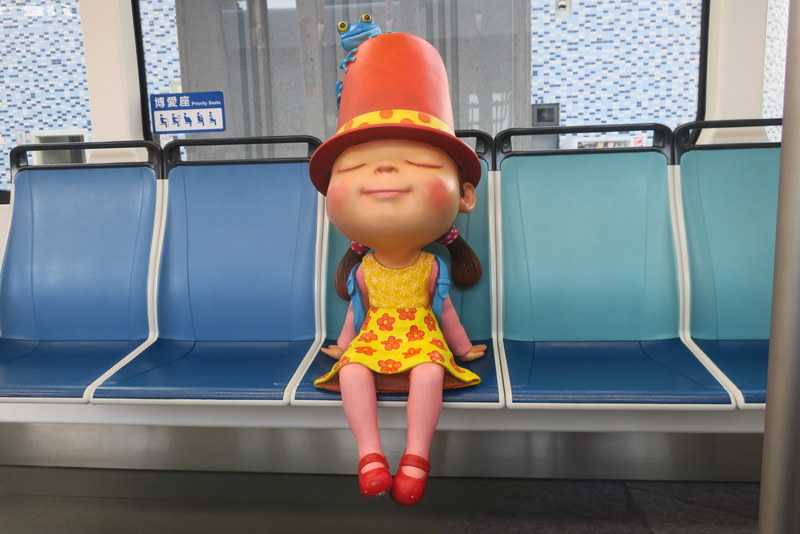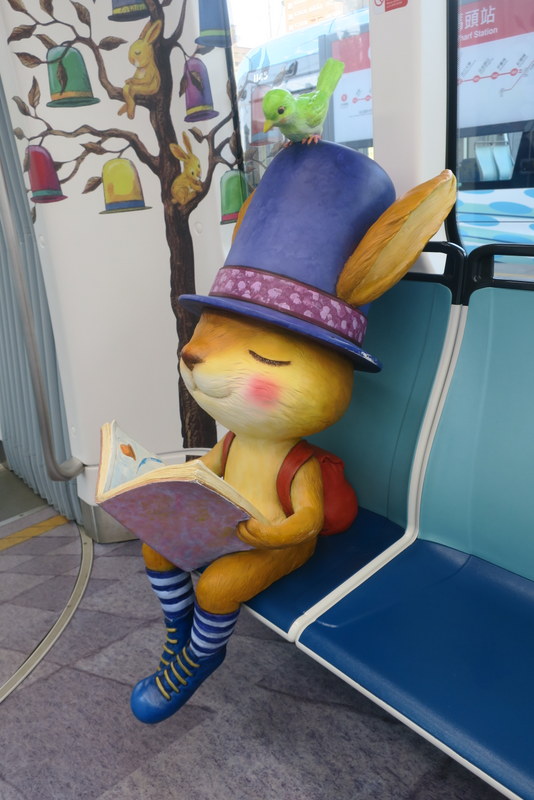 That’s also the terminus for the new Danhai light rail system. The trains are full of children’s book characters and fun art. Hey, we do things differently in Taiwan, there’s always something to make you smile! I took these photos at the terminus before everyone got on the train. Check them out!
