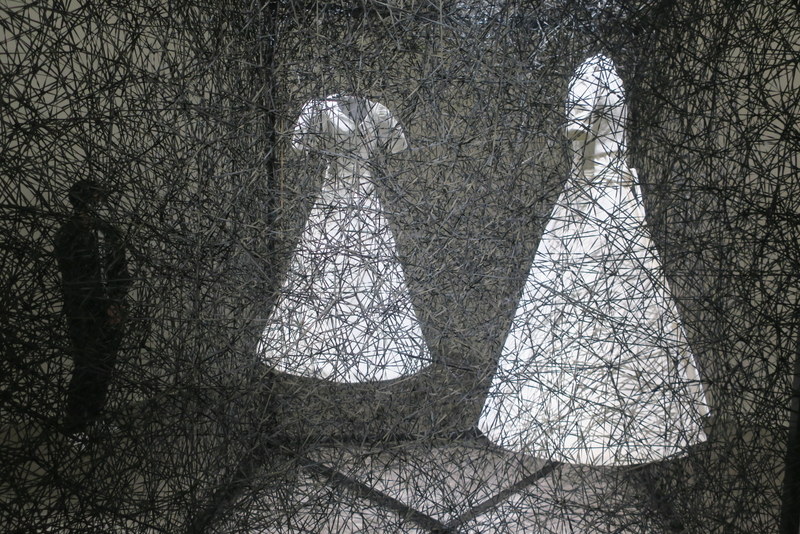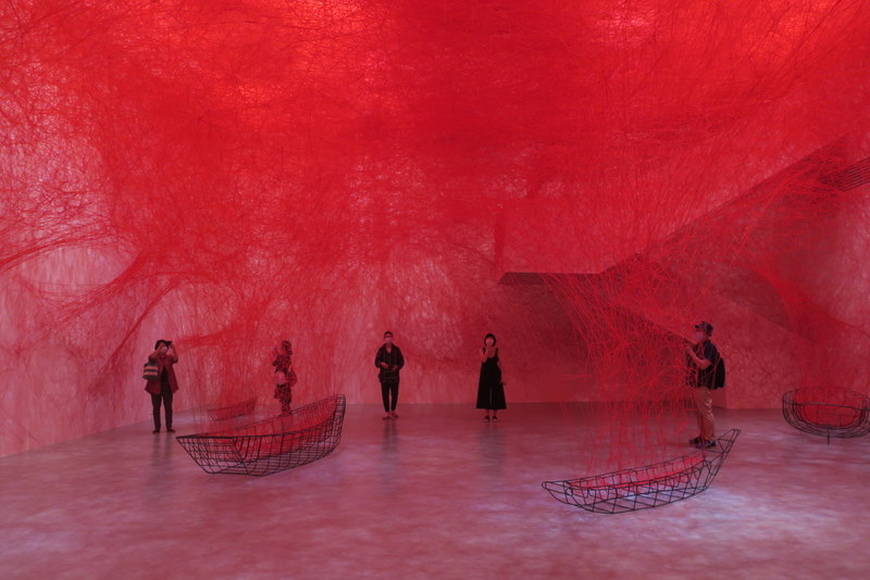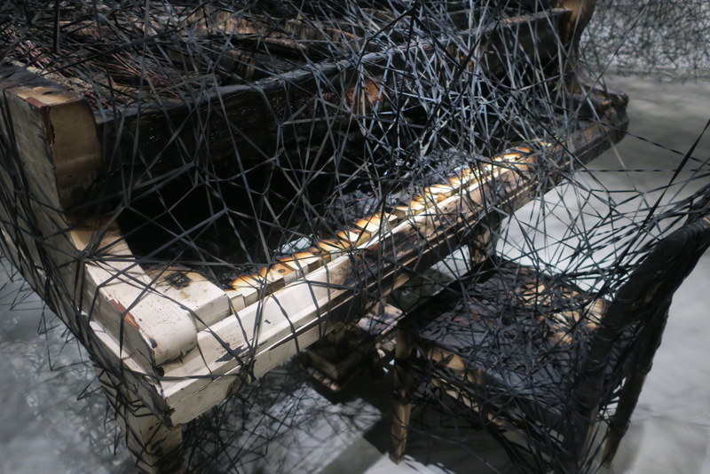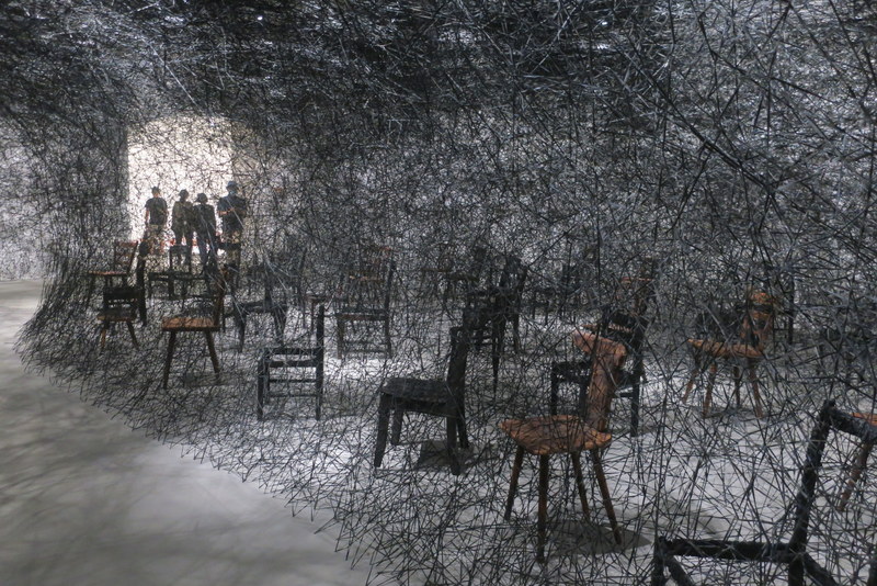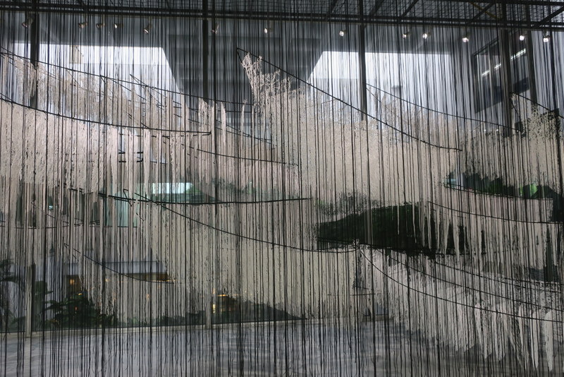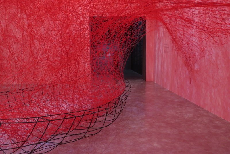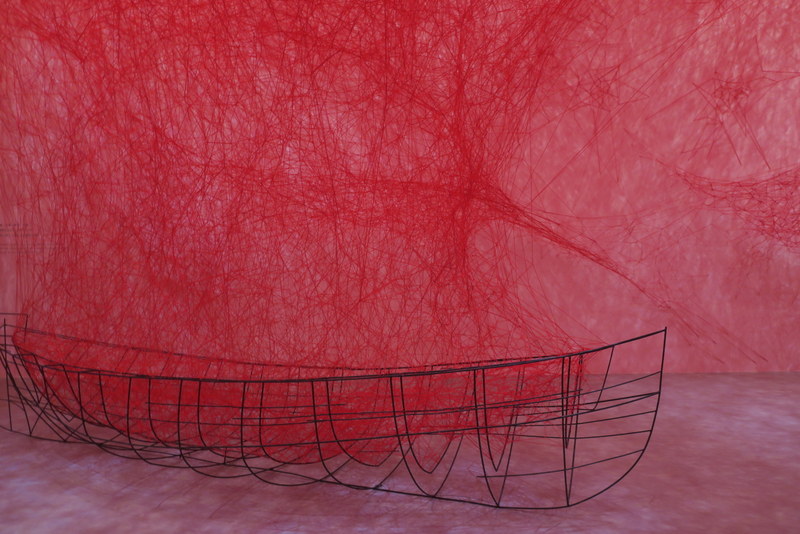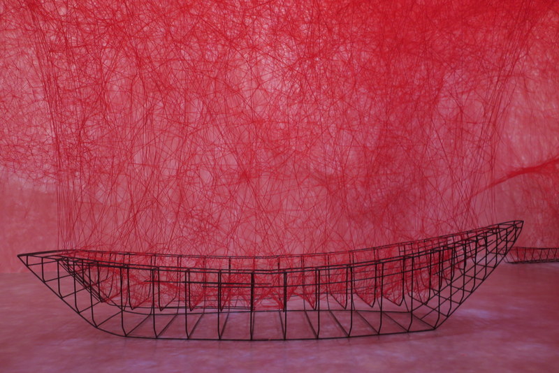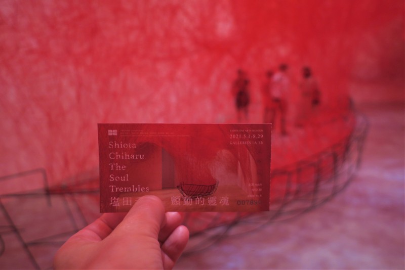 The exhibition is by Japanese installation artist Shiota Chiharu (塩田 千春), based in Berlin. The title, ‘The Soul Trembles’ means for her, the ‘emotional stirrings of the heart that cannot be put into words’. She says, “In today’s contemporary age, everything changes at a rapid pace, and value systems are in constant flux: it can seem as if the firm and unyielding beliefs that society as a whole has relied upon are themselves being lost”. Seems fitting for Taiwan’s current situation. She specializes in using thread, representing links and connections, which she weaves all around the room in a huge web-like canopy. Her most amazing installation is called ‘Uncertain Journey’, a vast net of bright red woven threads coming from black metal frames of boats. Truly stunning.