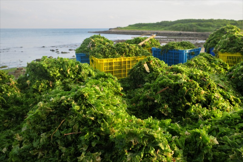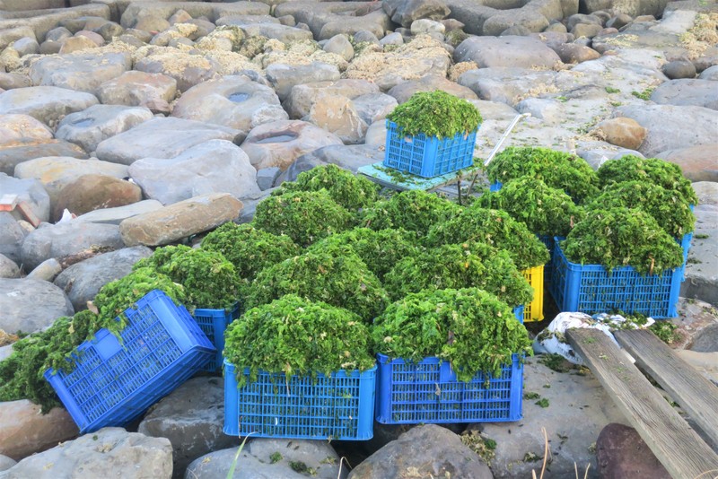 and at low tide, the workers go along to the other end of the bay to collect up the seaweed which they then feed to the abalone.