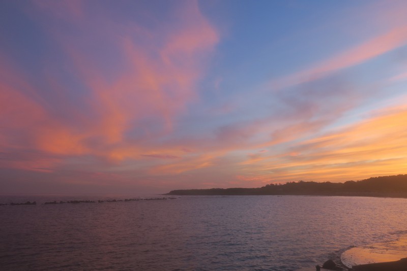 Recently, down at the sea, before sunrise, there were fireflies along the beach, flying over the seashore, and later a kingfisher flying from rock to rock along the water’s edge. ‘After the kingfisher’s wing / Has answered light to light, and is silent, the light is still / At the still point of the turning world.’ Sometimes the sea and sky seem to merge into each other on the horizon, and the light is still. Time to breathe in wonder. But sometimes it’s wild down there. Today’s News reports say a strong typhoon is developing in the Pacific Ocean and heading towards Taiwan at the end of this week. It seems that Typhoon Chanthu (璨樹) has jumped from a tropical depression to a Category 4 typhoon within 24 hours. So much for a ‘still point’. Typhoons have a still point at the centre, with the gale-force winds circling around, but we don’t go out looking, that’s for sure.