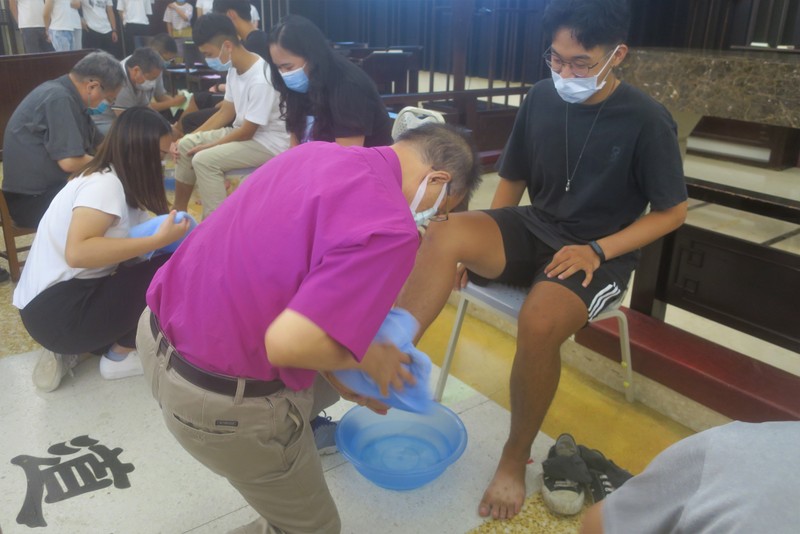 Although Taiwan as a whole is under Level 2 Restrictions, and gradually opening up, some areas up here in the north are seeing cluster infections, and further restrictions can / are / may suddenly be reimposed with immediate effect. Taoyuan has one Delta cluster – centred around 3 pilots, that has infected the teenage son of one of the pilots, but so far seems contained. Unconnected to that group is a different Delta cluster in the Greater Taipei area, centred on a kindergarten in southern Taipei (part of ‘New Taipei City’) with 23 confirmed cases so far. As a result, New Taipei City has today just announced ‘Enhanced Level 2 Restrictions’. Sports centers and places like libraries are to close for a week, and indoor dining is suspended. Yesterday they announced that 50 is now the max number of people allowed to gather inside, 100 outside, down from 80 / 300. This affects us, not only our Sunday services, but also St. John’s University (SJU), which started ‘Freshers Week’ (well, 3 days rather than a week) today, so adjustments to the program have been necessary. The training program for the student leaders for Freshers Week took place these past 2 days, assisted by our student fellowship. It finished with a ceremony in Advent Church yesterday, part of which included Bishop Lennon Y. R. Chang (as chair of the SJU trustees) and some of the alumni taking part in foot-washing, as they washed the feet of the student leaders…